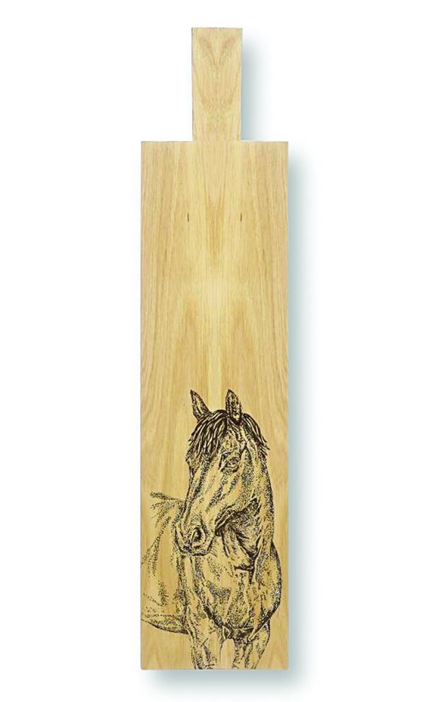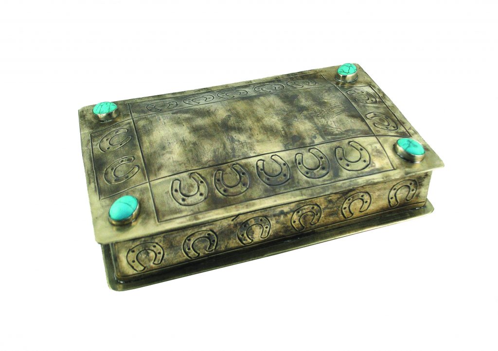 [1] Horse Portrait Long Oak serving paddle ($90), store.nationalcowboymuseum.org [2] Stamped Horseshoe box with turquoise ($155), jalexanderrusticsilver.com [3] Faith by B. Yellowtail blanket ($255), eighthgeneration.com [4] Rio Latigo wine carrier ($149 – $349), krsaddleshop.com [5] Rawhide Drum Coffee Table ($1,999.99), lorecranch.com [6] Wild Horses of the West by Jan Drake coffee table book ($50), maverickwesternwear.com [7] Cowboy Ranch Recliner ($4,800), adobeinteriors.com