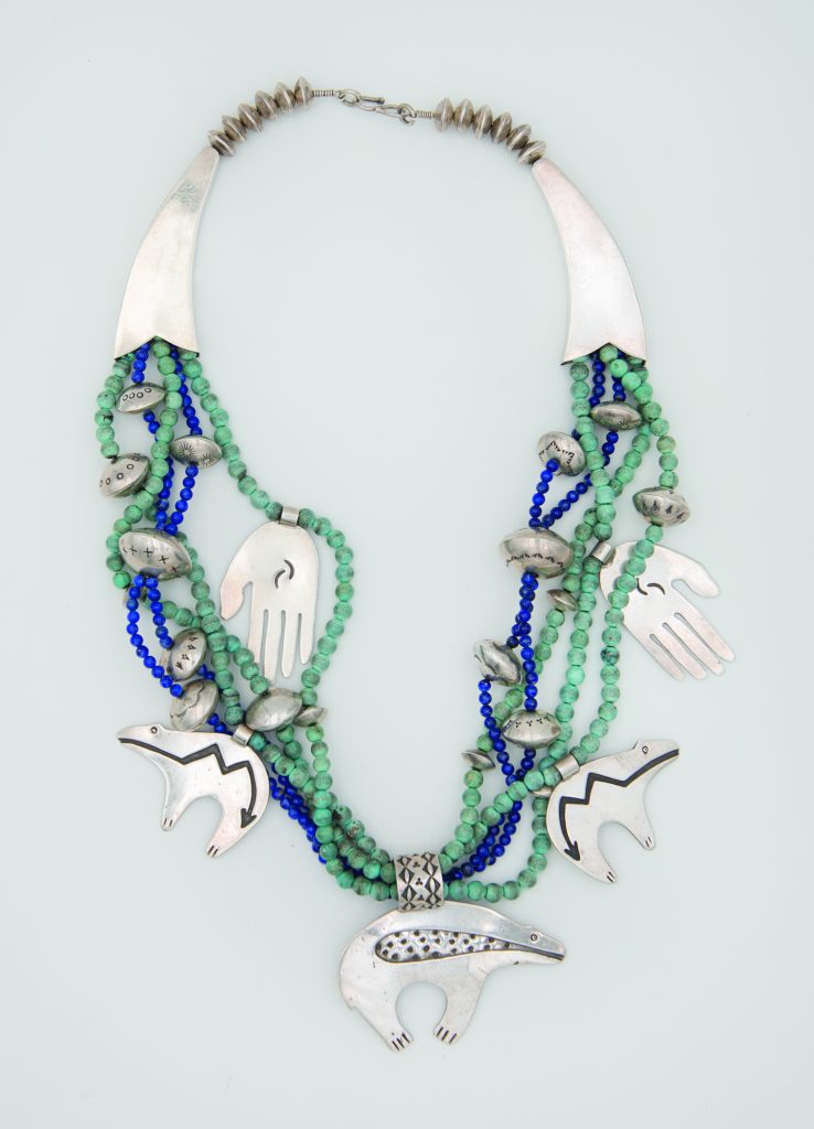 [1] Under His Wings deer leather bracelet ($55), buckaroobling.com [2] Handmade Sterling Desert Cuff with turquoise ($1,200), sabrinathiel.com [3] Bennie Ration (Navajo) 5-strand pendant necklace with sterling silver and turquoise ($3,000), jewelryladyriver.com [4] Mary Louise Tafoya (Kewa Pueblo) Santo Domingo Pueblo Inlay necklace ($305), wyominghome.com [5] Ben Nighthorse (Navajo) Soaring Eagle necklace ($6,500), sorrelsky.com [6] Multi-strand Sonoran Gold necklace ($850), sylviamjewelry.com [7] Royston Green Geometrico earrings ($700), rockigorman.com