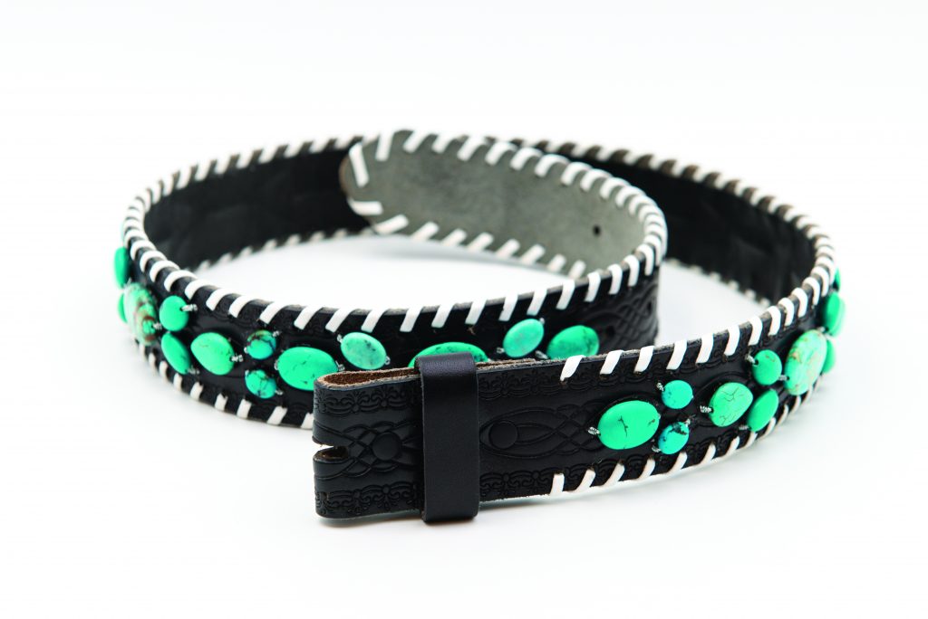 [1] Lizard and Cow leather blue boots ($1,740), rockiesrebels.com [2] Clara olive green suede boots with rainbow stitching ($234.95), justinboots.com [3] Artisan Western belt with Kingman Turquoise ($650 – $850), westerndove.com [4] Roughout belt and Vintage buckle set ($600), chieffaloamericana.com [5] Sandal Style Women's Moccasin ($94), sanagustintradingcompany.com