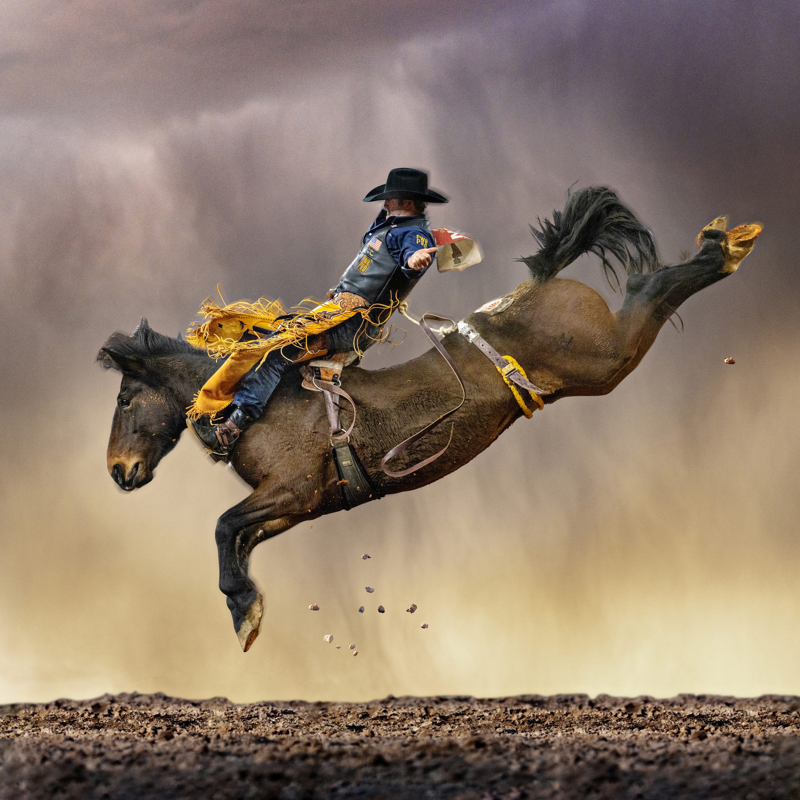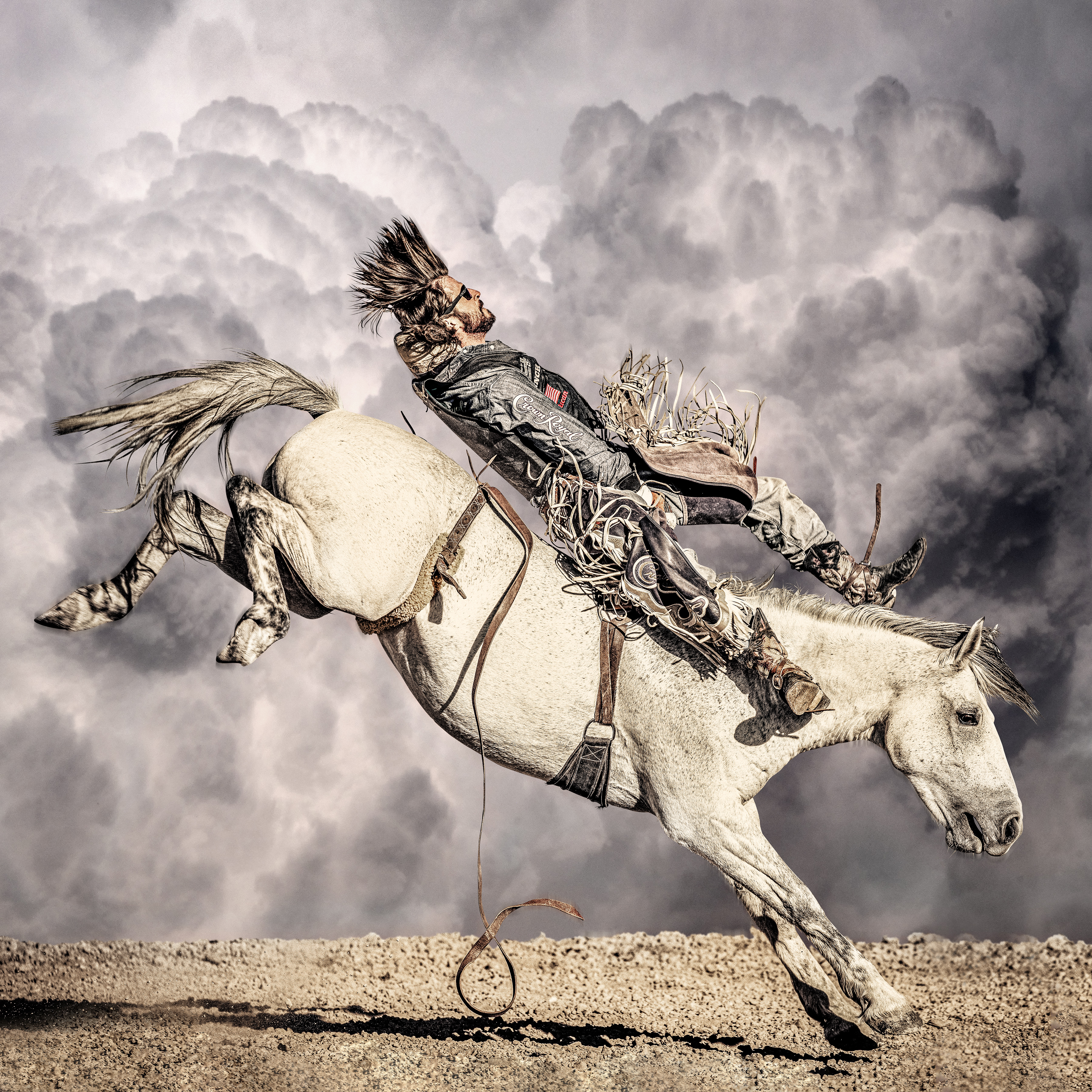 When he selects his favorite images, he digitally manipulates the raw files, extracting the subject from its environment and adding in Western landscape backgrounds he's shot elsewhere, like craggy Utah mountains and billowy Texas clouds. By positioning the rodeo shots in Western landscapes, Wrubel proposes the idea of moving outside a comfort zone and returning to the Wild West.