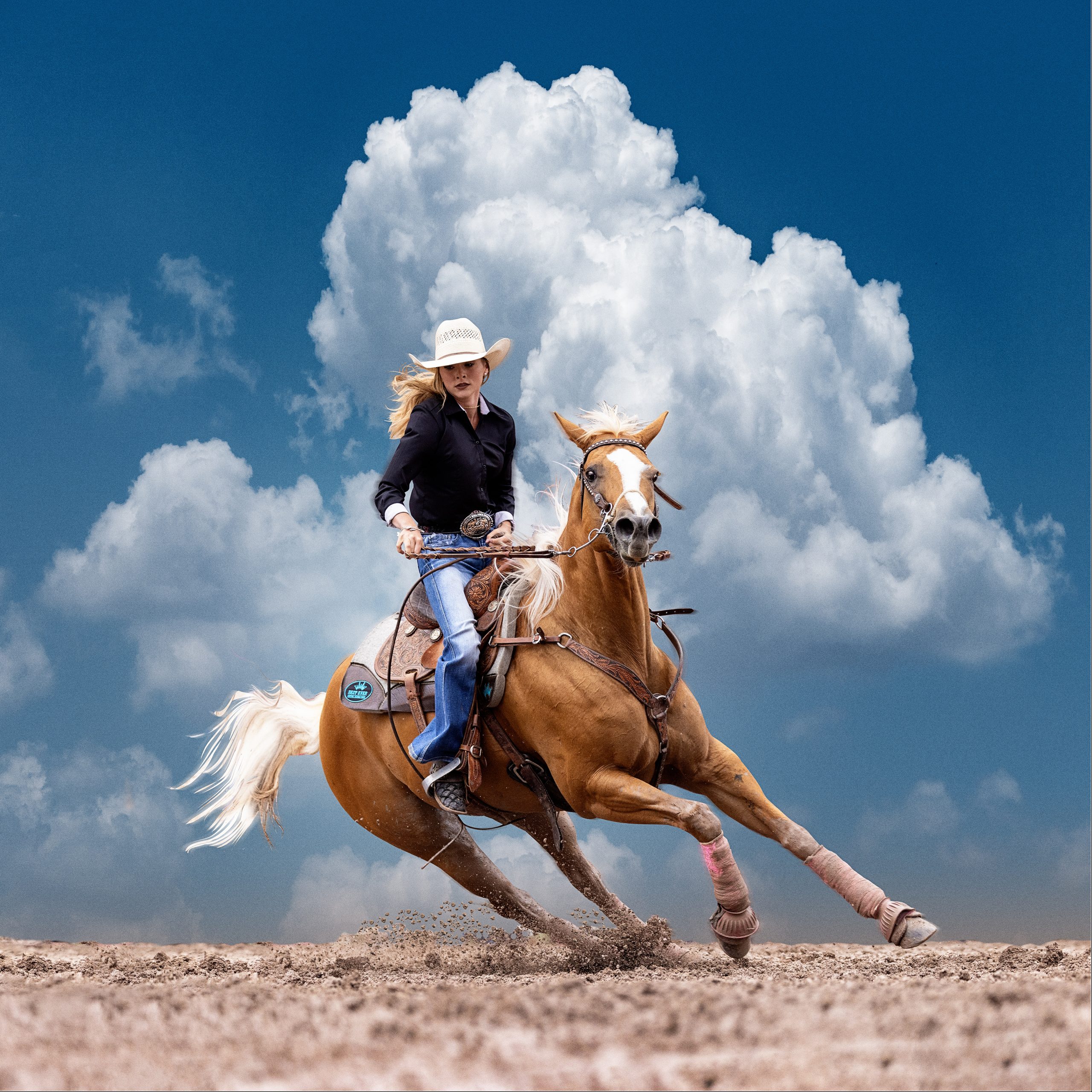 A female barrel racer on a gravity-defying titled horse under an azure sky comprises the idyllic Buckle. "Those two are working 100 percent in unison," he says. "That horse wants so badly to do a good job with that rider. And that rider wants to work with the horse to get the job done. When they both do, they're proud together."