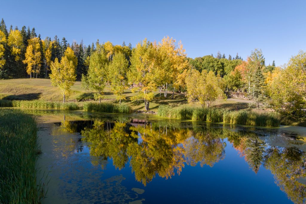 There simply isn’t a bad view to be found here thanks to sweeping vistas, gentle slopes covered by groves of aspens, lush open meadows and parks, a beautiful lake, and ponds stocked with trout. There’s also a fenced perimeter of 6.75 miles that’s an ideal barrier for controlling livestock.