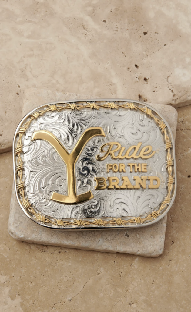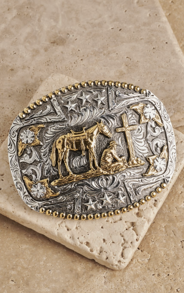[1] Attitude by Montana Silversmiths Yellowstone Silver Filigree Gold Y Ride For The Brand Gold Barbed Wire Belt Buckle ($36.98) [2] AndWest Two-Tone Oval Praying Cowboy Belt Buckle ($49.99)