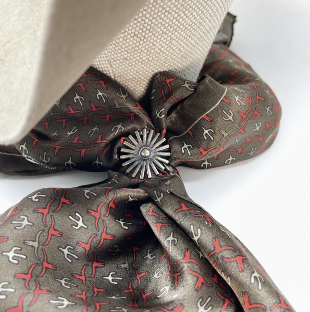 [1] Western Yoke silk scarf ($64) [2] Spur Rowel scarf slide ($84)