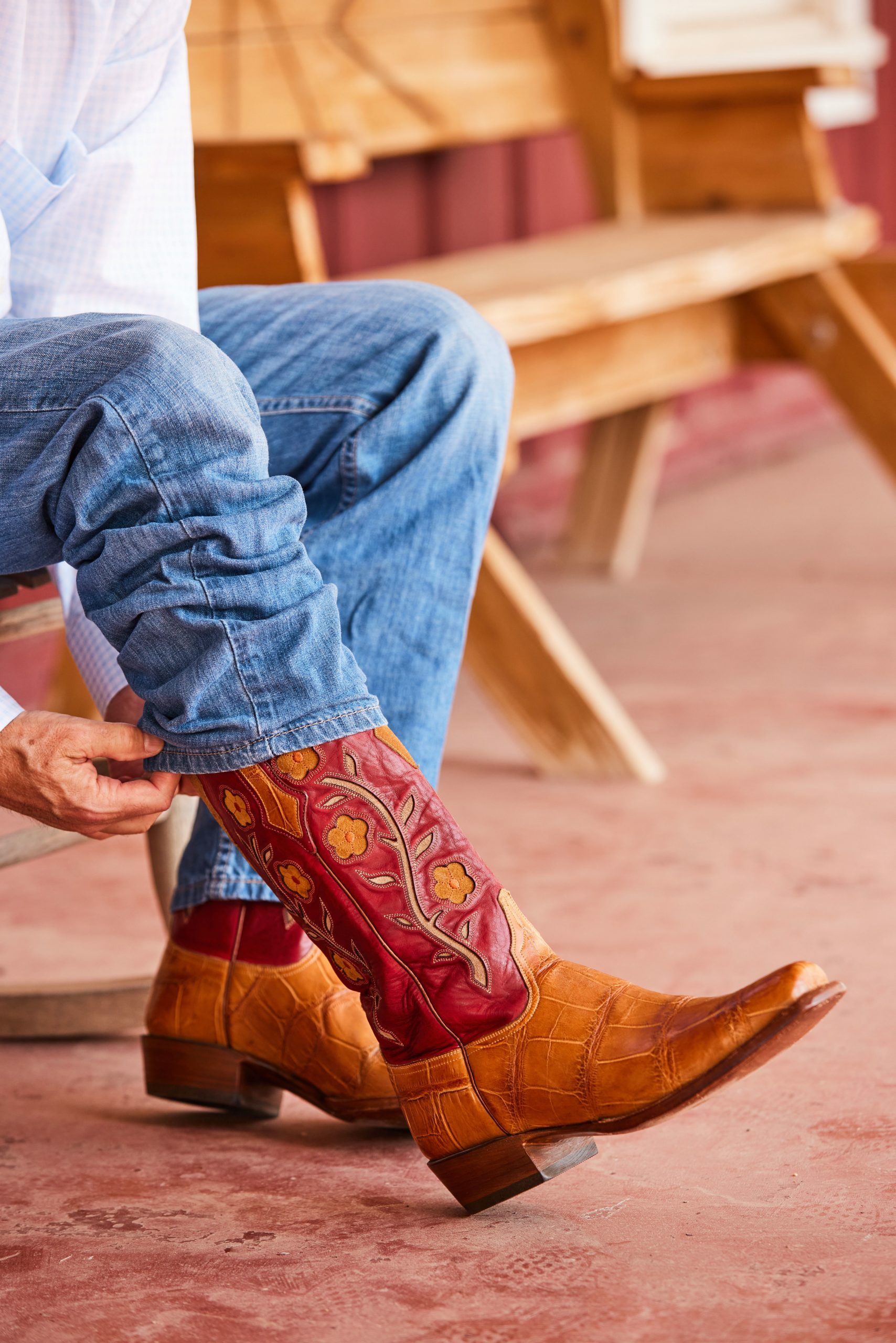 The Cibolo is a Western-style boot crafted from wild-caught Giant Alligator and is pure romance—ready to be shown off in any city or saddle. Reminiscent of the coveted country-western clothing of the 1950s and early 1960s, the design incorporates suede floral inlays and a scallop around the collar. Available in Butterscotch, Bordeaux, Mustard, and Redwood.