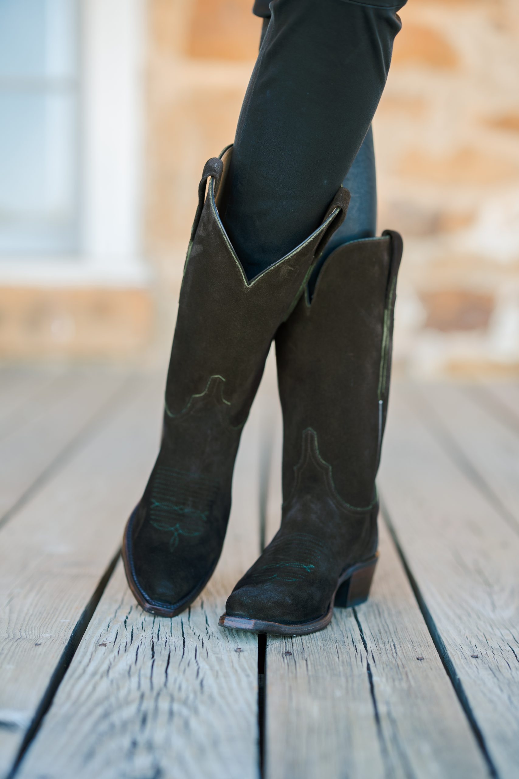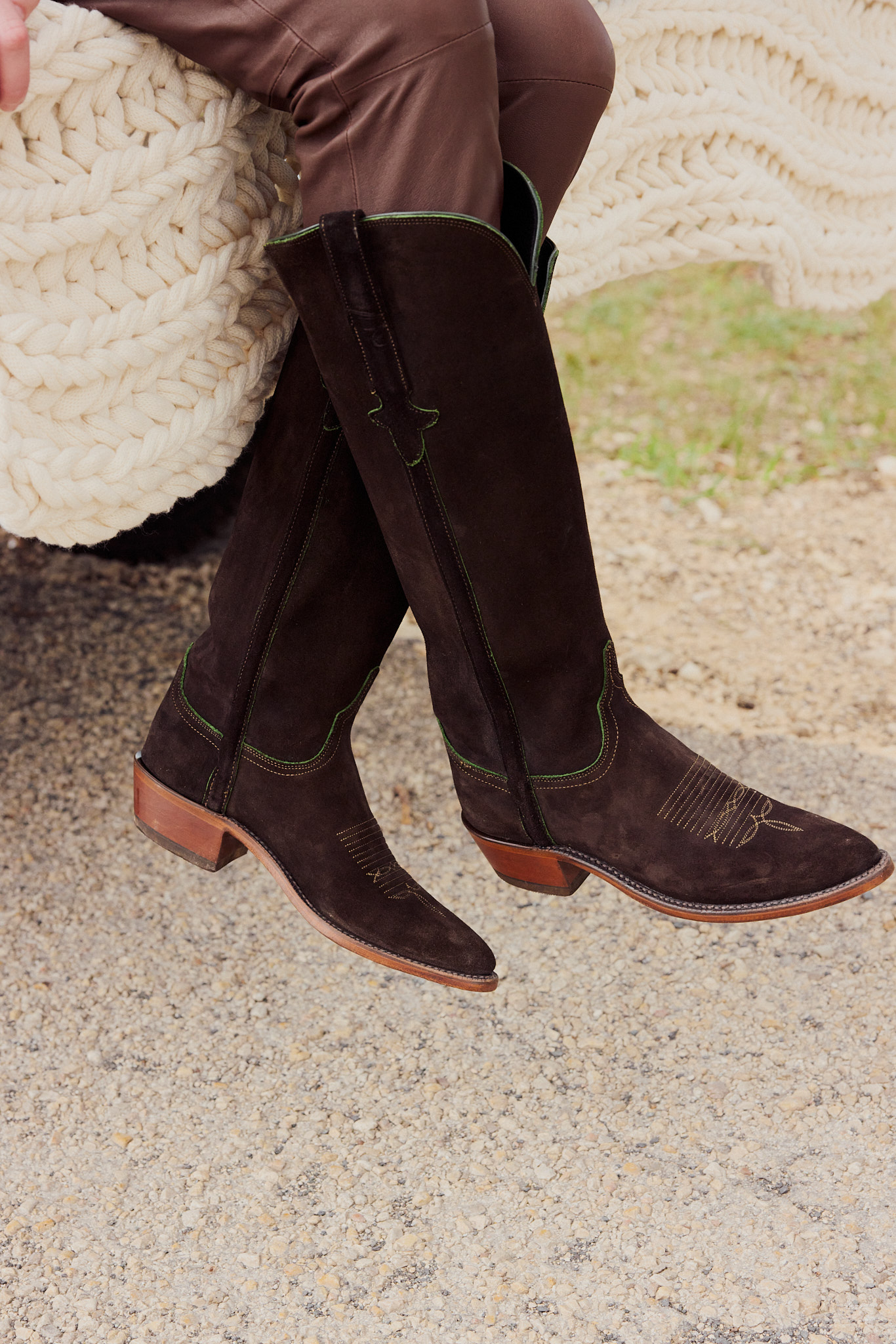 Crafted from silky scuff-off sandwich suede, the Edie is elegant in nature and yet commands attention. This tall boot features Western styling, an exterior Torero side seam, and Kennedy pull straps. Available in Burgundy, Black, Calvary Blue, Dark Olive, Red Dirt, and Fig.
