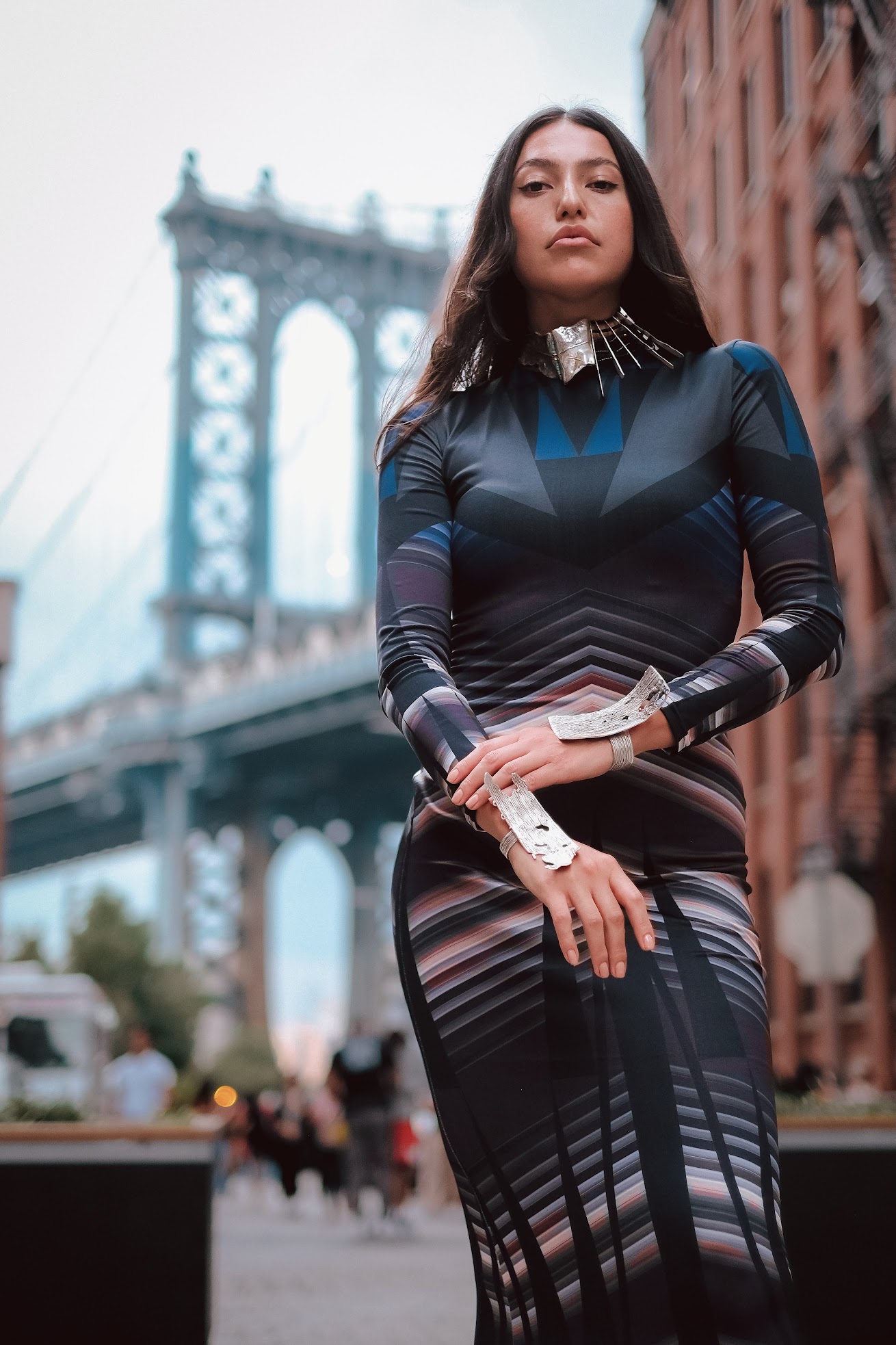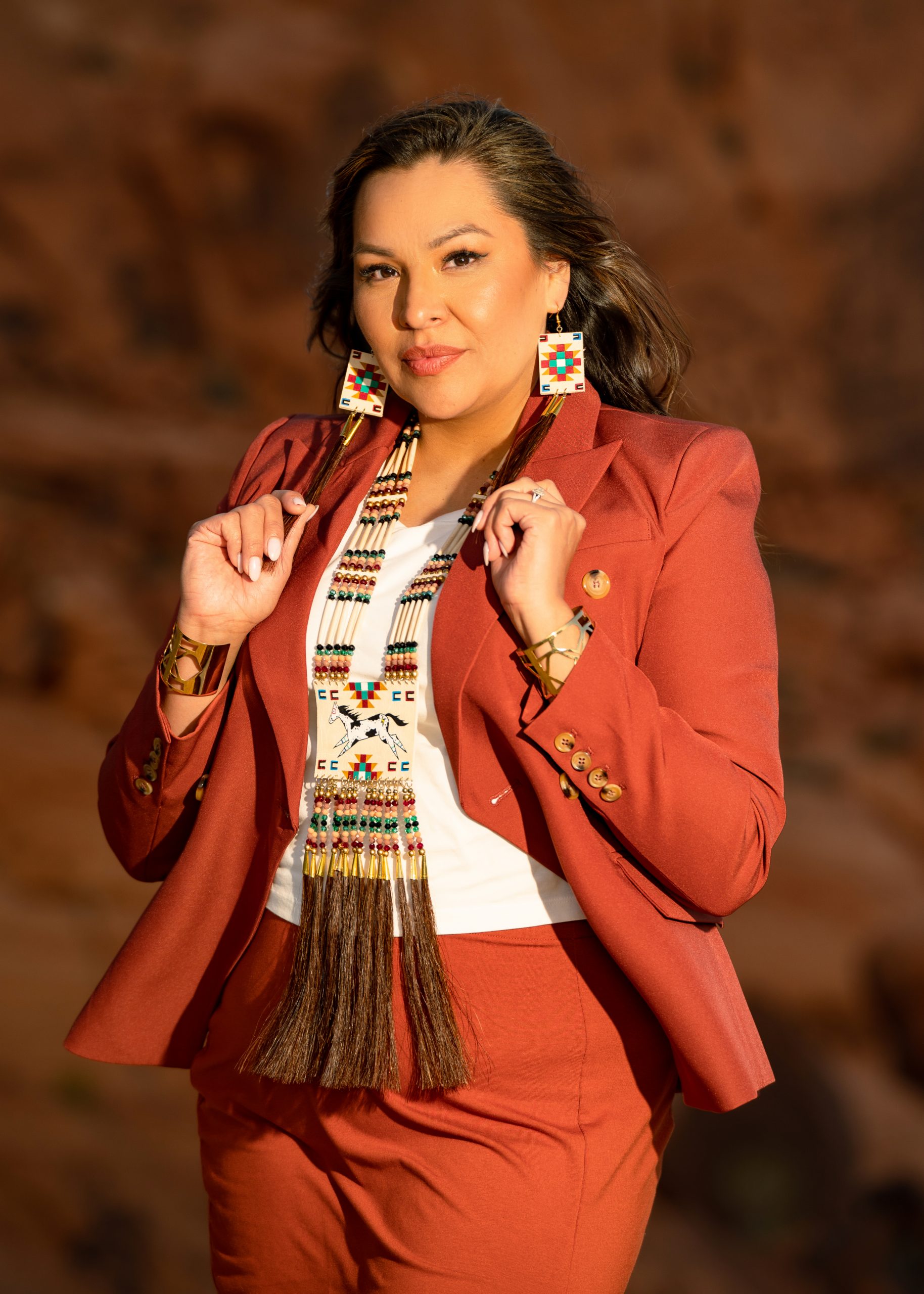 Lookinghorse-Smith is a self-taught fashion designer and the creator behind her eponymous K. Lookinghorse brand. She is Hunkpapa Lakota from South Dakota and a member of the Standing Rock Sioux Tribe. As one of the Top 10 Global Emerging Designers in the 2023 Emerging Designer Bootcamp participating in Phoenix Fashion Week (October 20 – 21, 2023), she will be showcasing “The Timeless Collection” — a collection displaying archival photos through a modern lens to show audiences that Indigenous people don’t just live in the past.