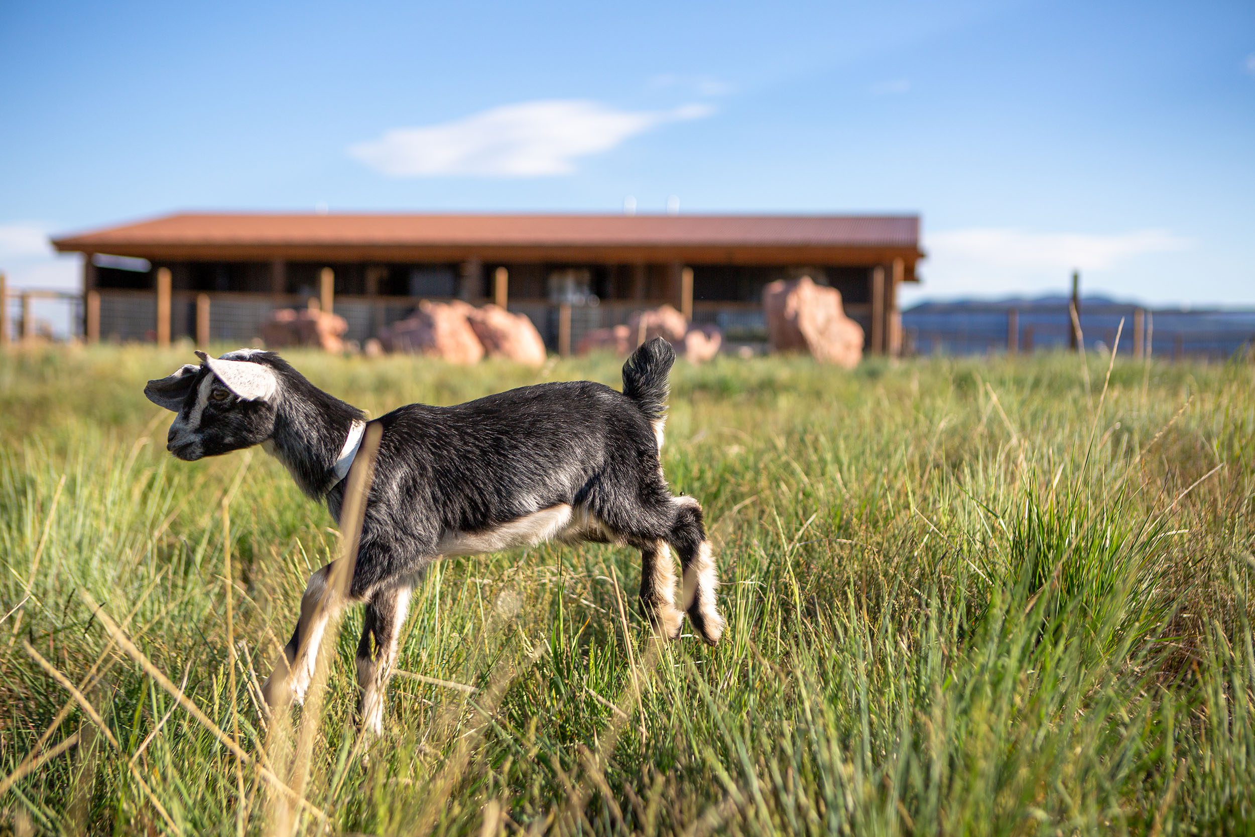 A tannish-brown Nubian goat basks lazily in the Wyoming sun with a look of pure contentment on his face. Behind him, a few mischievous mini-Nigerian goats climb atop their metal feeder and munch on hay. But when farmer Ben Elzay opens the gate to their spacious outdoor enclosure, the animals make a bleating beeline straight toward him. “Come on, kids,” he says in a high-pitched voice while clapping his hands. “Let’s go.”