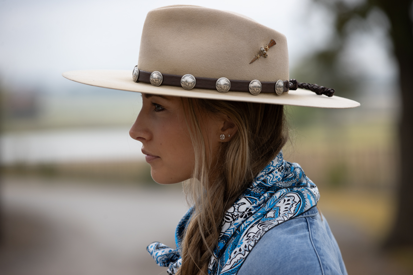 Grit Sahara hat with buffalo nickel poncho band, kemosabe.com; Bandana blue silk wild rag, cowboywildrags.com.
