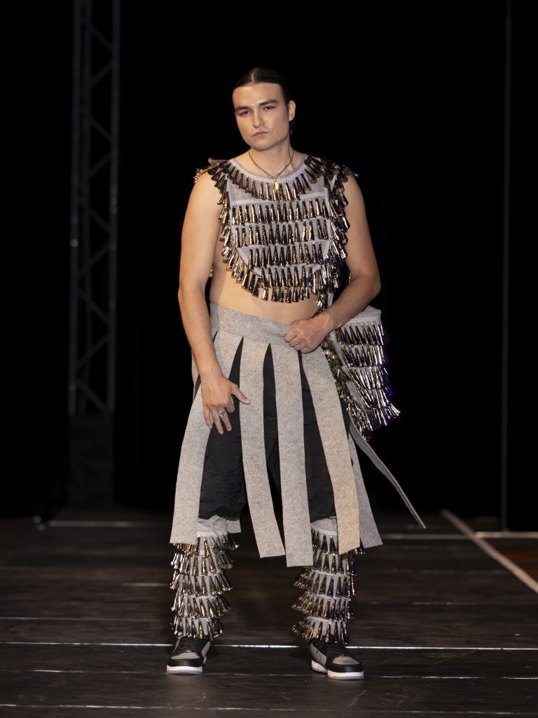 Native people come in all shapes, sizes, and genders, so the recognition of that on the runway shows felt like a reflection of the real world — with professional beauty help. Kicking off the event was House of Sutai by Peshawn Bread, which brought out brightly colored graphic outfits with intricate beaded neckpieces featuring pearls and dentalium shells worn by a diverse collection of models. A roller-skating beauty expertly danced the U-shaped length of the platform to a roar of applause as D.I.S.C.O. by Ottawan played. It was a powerful statement of the new and now.