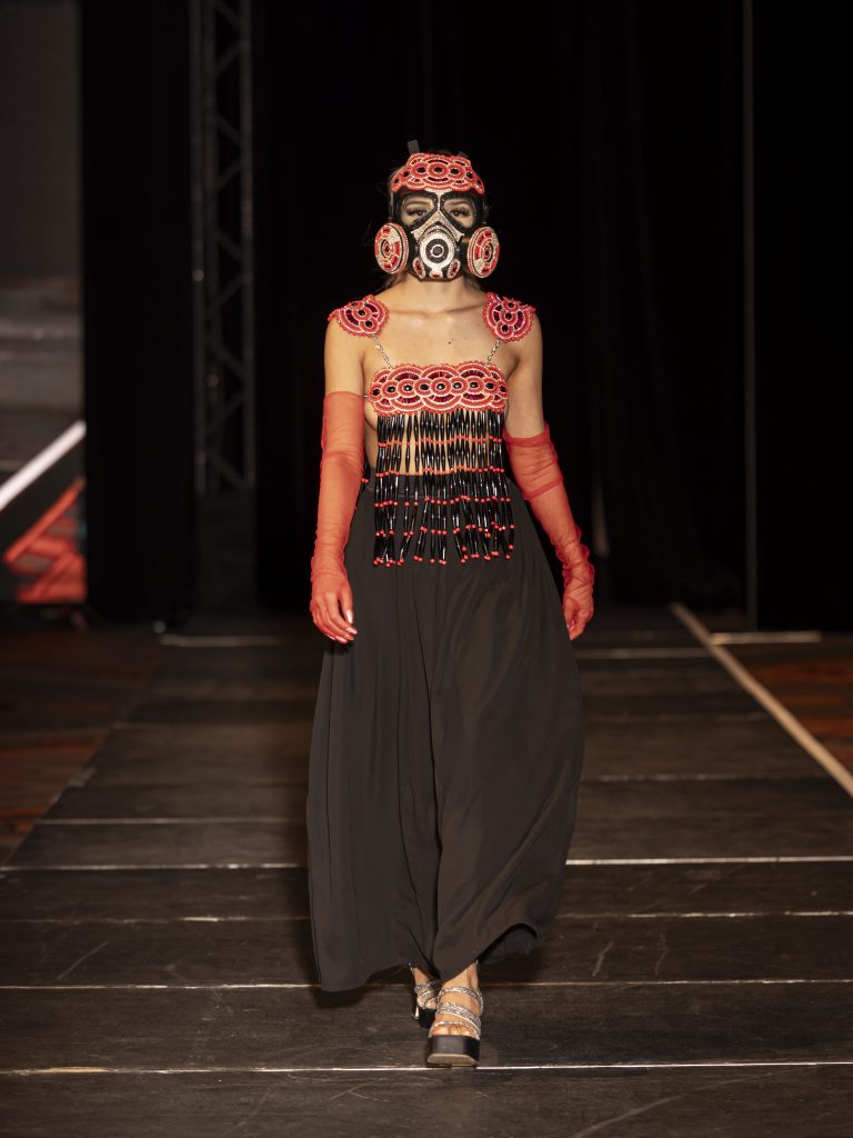 No Native look is complete without jewelry, and major pieces were on the models, in the crowd, and in the popups. Star jeweler Kenneth Johnson showed his Seminole roots with intricate pieces in silver, featuring turtle designs that graced earrings and pendants. Cody Sanderson is known for his stars in silver. His flashy knuckle-to-knuckle rings were everywhere. Indi City is pushing the length of their acrylic earrings to more than a foot in geometric designs that glitter from earlobes to the waist. Prize for the most daring accessory goes to Helen Oro and her beaded gas mask in orange and silver.