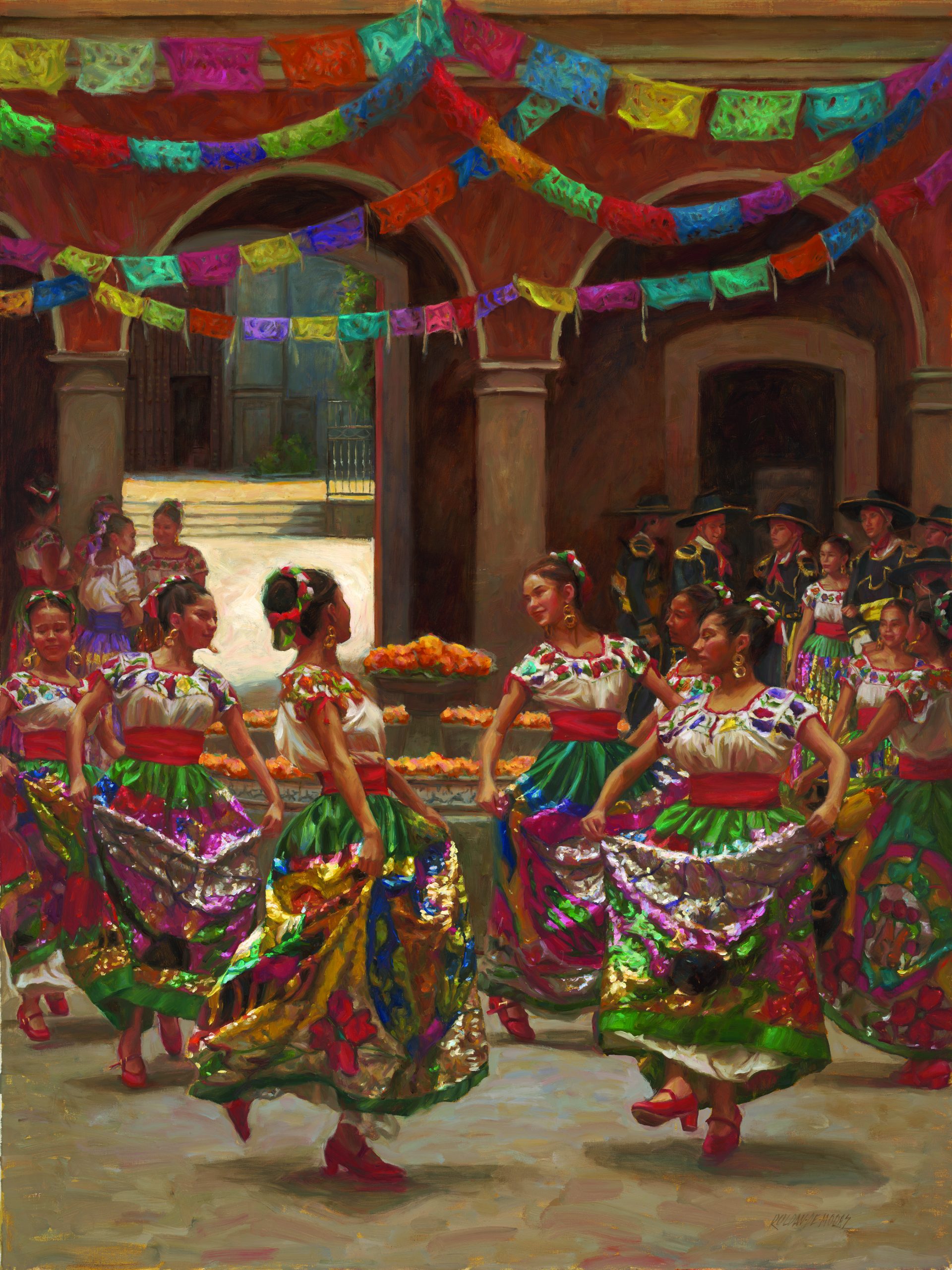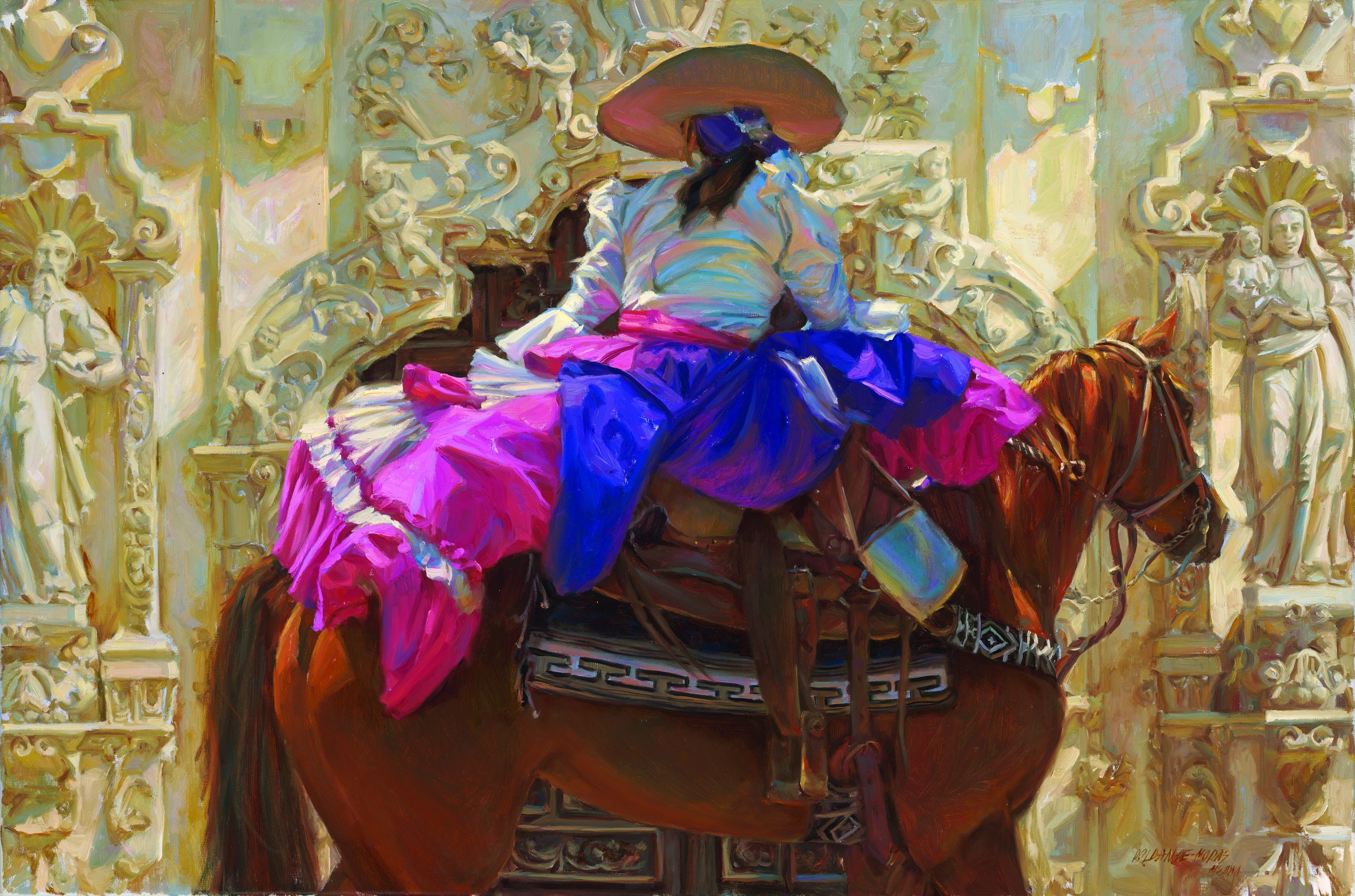 Indeed, Spirit of San Antonio, like so many of Roldan-de-Moras’ works, is a visual symphony. An escaramuza pauses on horseback in front of the doorway of San Antonio’s Mission San José. The painting is unique in its positioning of the escaramuza in the foreground of the painting. “[Women] are a very important part of the charrería tradition, but they were always in the background,” the artist says. Her goal was to give the escaramuza her own story and rightful place, on the canvas and in the larger narrative of the tradition.