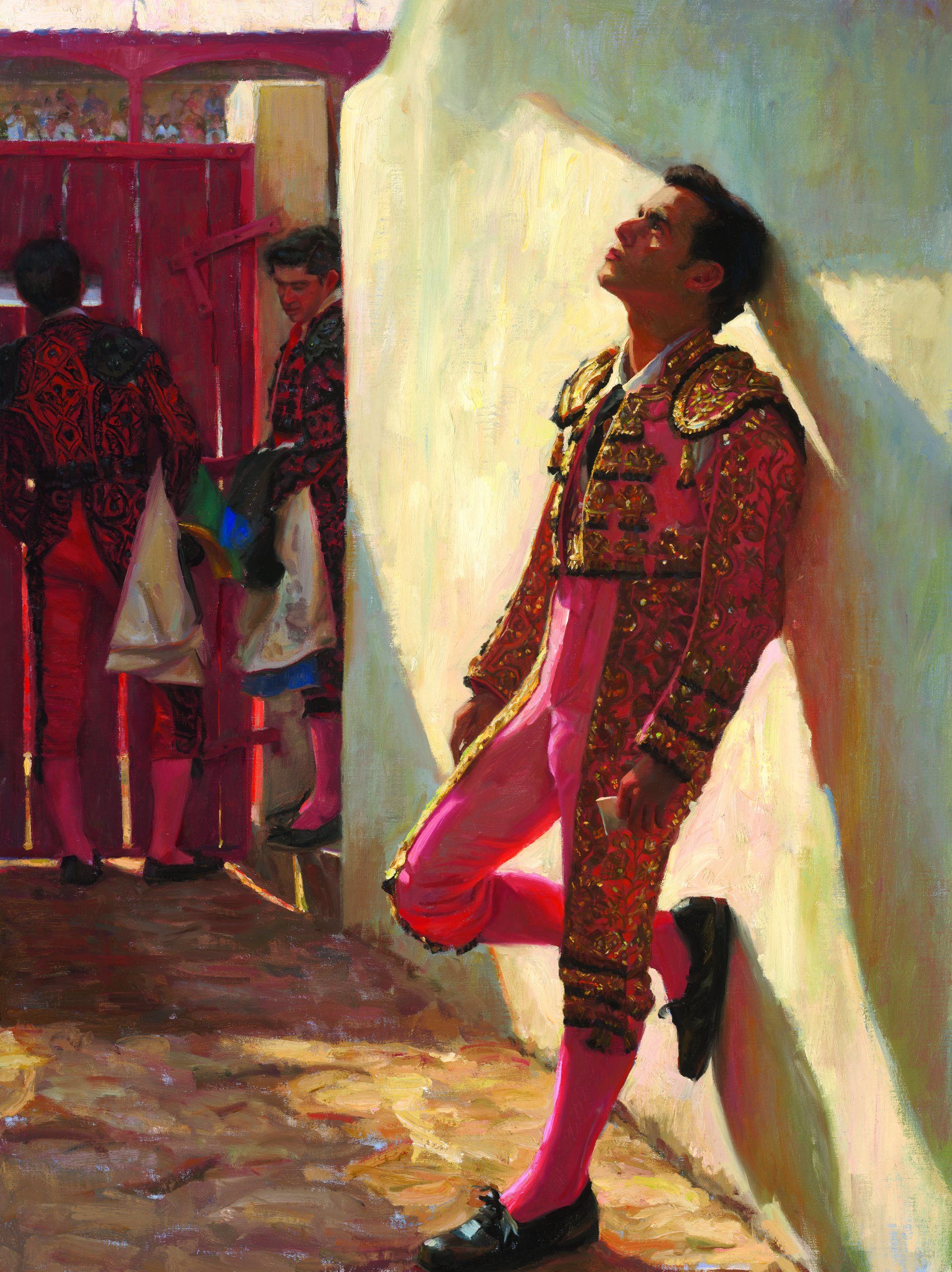A young matador, dressed head to toe in traditional Spanish bullfighting attire, leans against a building as he anticipates his entrance into the arena. He gazes upward, focusing on something just beyond the stretch of the canvas, possibly something entirely invisible. Harking back to turn-of-the-century impressionism, the canvas is bathed in light. The elaborate bright-pink matador’s costume shines in the sunlight; perfectly aligned shadows stretch across the stark white adobe wall behind him. But, as dazzling as it is, the suit of light is not the story. It’s what’s in the matador’s eyes. “I wanted more of an introspection. What was he holding in his hand? What was he thinking about,” explains painter Gladys Roldan-de-Moras.