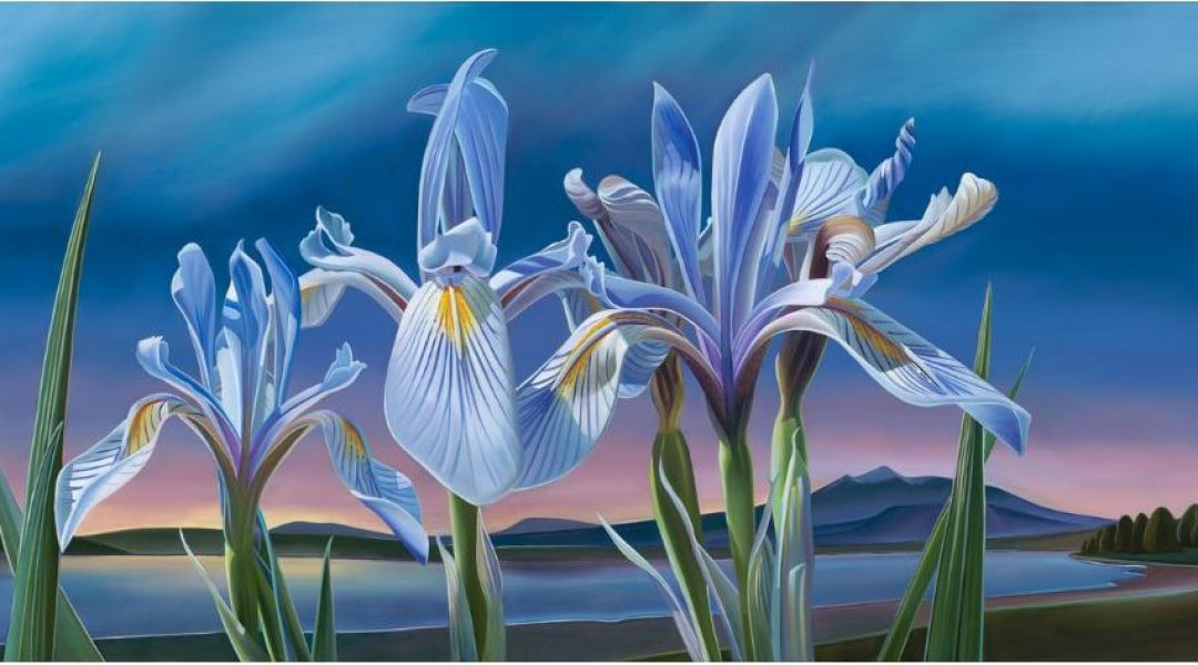 FEATURED IMAGE: Blue as the Skies Above — Wild Irises, Mormon Lake and San Francisco Peaks, AZ. 30 x 60 inches, oil on canvas.
