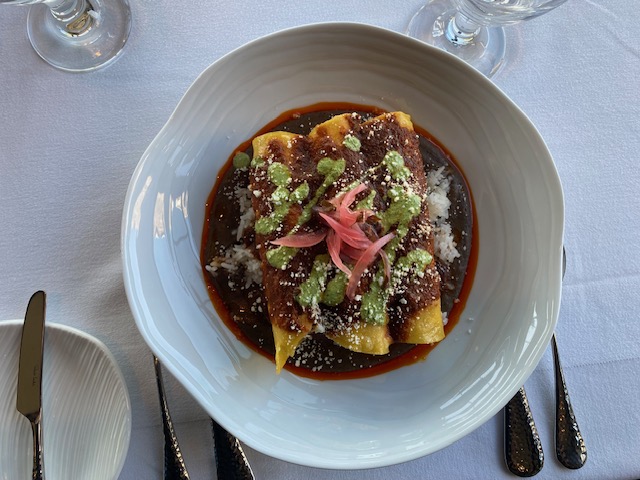 - Top rice with the enchiladas and add the cilantro crema over the top.