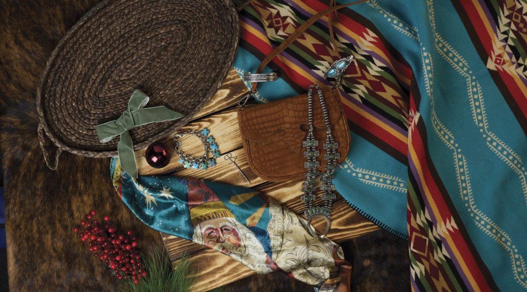 HEADER IMAGE (Clockwise from Top Left): Dolan German Santa’s Steed silk scarf, fringescarves.com; Hello Charming turquoise crosses bracelet, danavoorhees.com; Rockin’ PR custom brand silver toothpick, desire2b.com; Lainey exotic crossbody, lucchese.com; Vintage cuff with stamp detail, teneeestelletradingco.com; Sierra Bella turquoise rattlesnake ring, wildatheartsilver.com; Emerald Valley squash blossom, teneeestelletradingco.com.