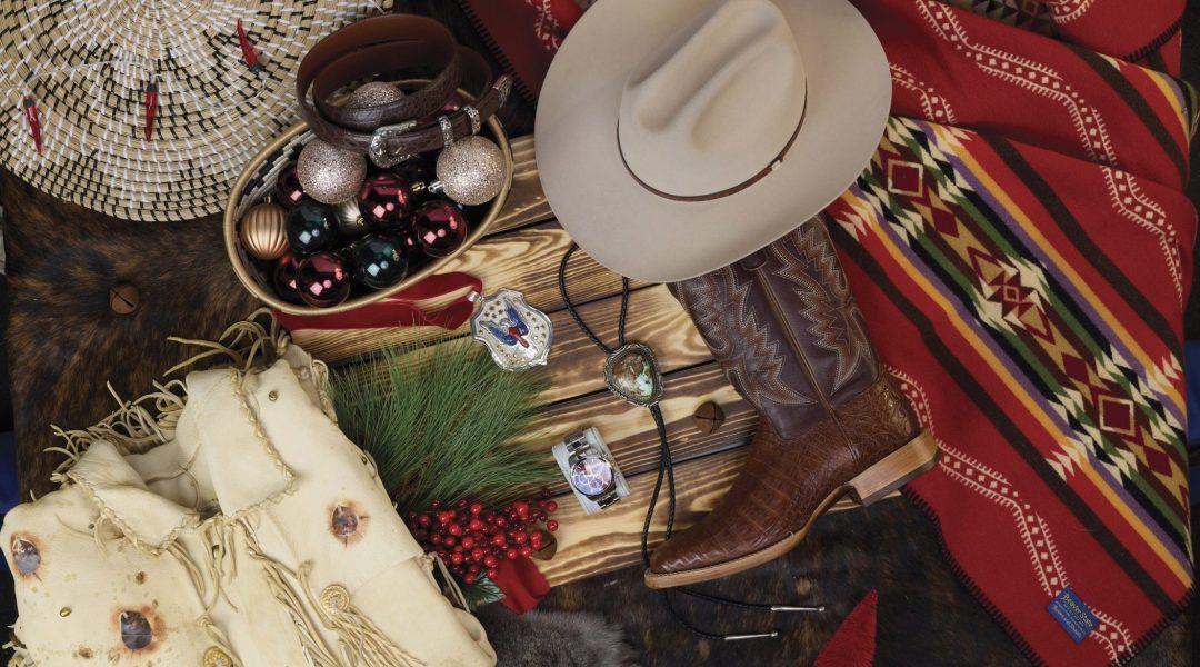 HEADER IMAGE (Clockwise from Top Right): 100X Silverbelly cowboy hat, thehatstore.com; PRCA collection Caiman belly boots, durangoboots.com; Oversized bolo on leather cord, teneeestelletradingco.com; Buffalo watch with burgundy sapphire crystal Swiss chronograph, thegoldenbuffalo.com; Ben Nighthorse (Northern Cheyenne) Shield pendant, sorrelsky.com; Homage to Buffalo Bill leather barn coat, montanadreamwear.com; Four piece buckle set on brown alligator belt, thehatstore.com.