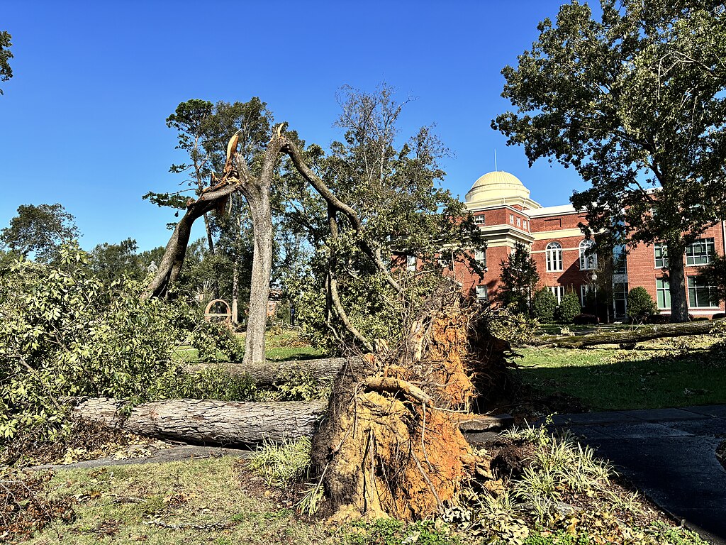 Uprooted and damaged trees on the campus of Presbyterian College in Clinton, South Carolina, on September 30, 2024, following Hurricane Helene.
