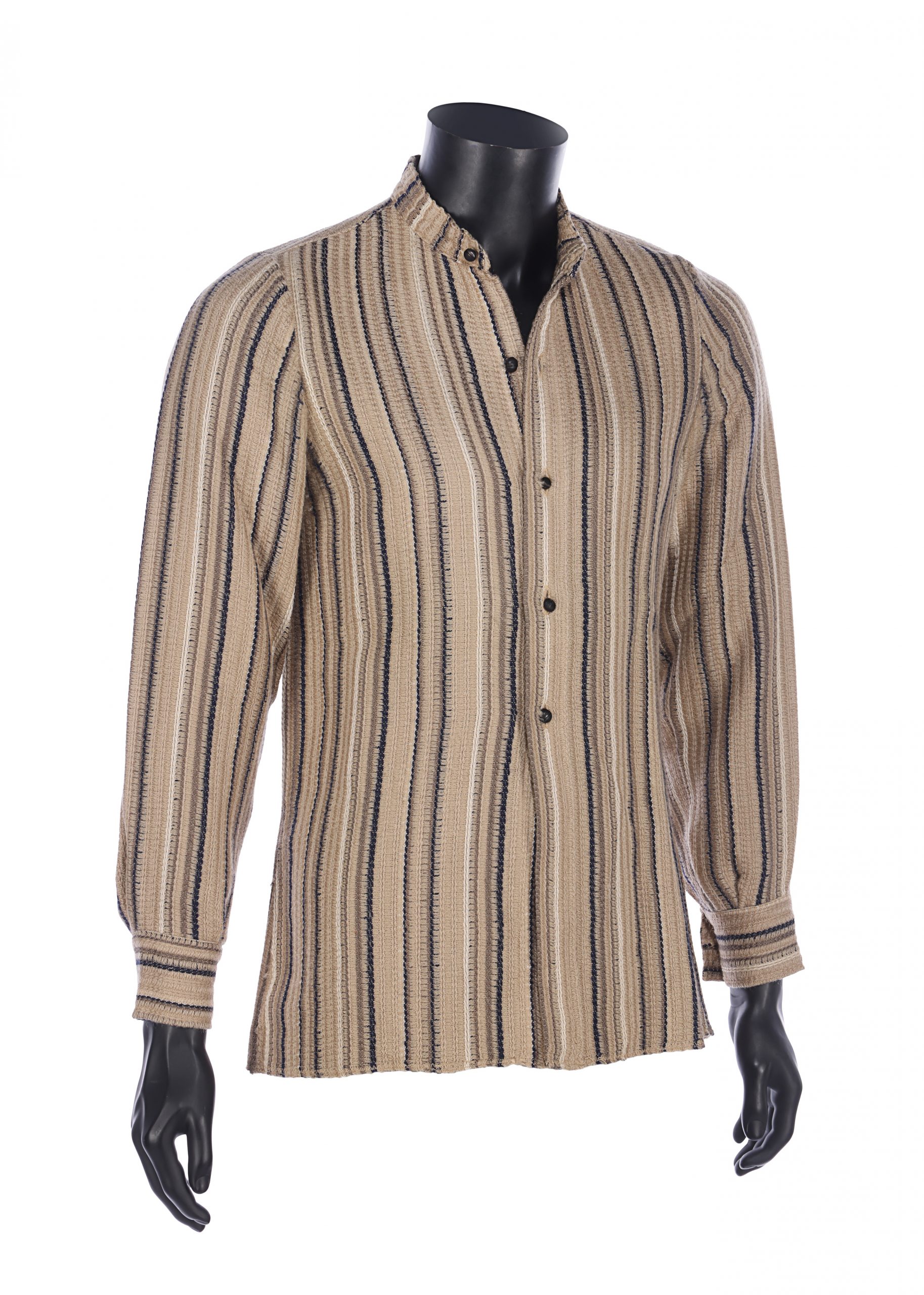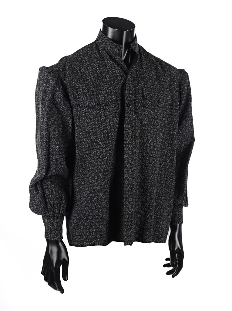 The black cotton shirt has an interior label from Italian costume supplier Costumi d’Arte Peruzzi. It features two chest pockets, a grandad-style collar, and a white circles-and-spots pattern. This item is likely to have been rented to numerous productions over the decades since filming. Some minor modifications may have taken place during that time and the shirt has been repaired in several places since the production.