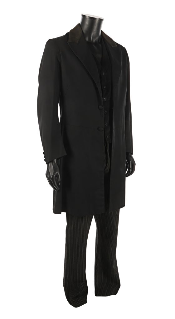 The costume comprises a black satin frock coat with a suede collar and a handwritten label in the neckline reading “Liy Van Clyft [sic]”; a black corduroy waistcoat labelled “Liy Van Cliyft [sic]”; and a pair of black trousers with white pinstripes labelled “Liy Van Clyft [sic]”. Each clothing item has interior labels from Italian costume supplier Costumi d’Arte Peruzzi. The costume pieces have some very minor discolouration.