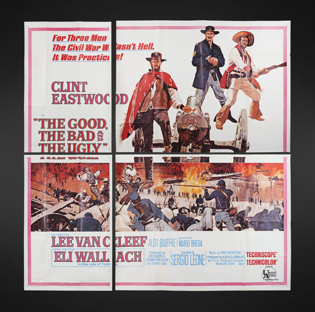 The film is lauded as one of the greatest spaghetti Westerns ever made, with any paper from the film highly sought after. Offered here is an incredibly scarce US Six Sheet printed into four separate sections, with this example retaining its bright colors. The posters are folded and have some minor handling wear, but overall remain in very fine condition. Dimensions: 206 cm x 206 cm (81” x 81”)