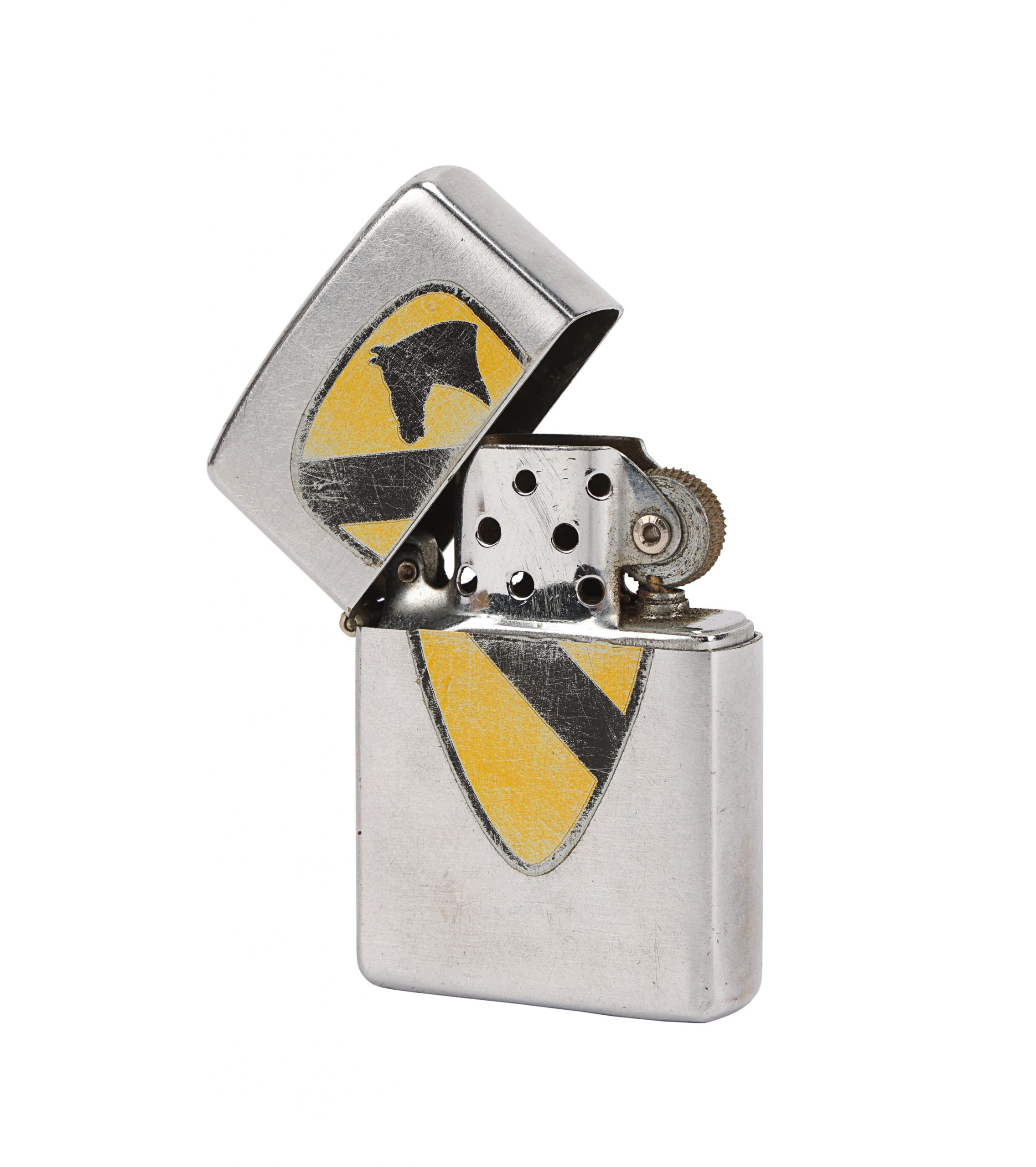 The metal lighter features a sticker with the yellow-and-black emblem of the US 1st Cavalry Division, in which Walt served during the Korean War. The lighter is sold unfueled, its spark remains functional. Dimensions: 1.5 cm x 4 cm x 5.75 cm (0.5” x 1.5” x 2.25”)