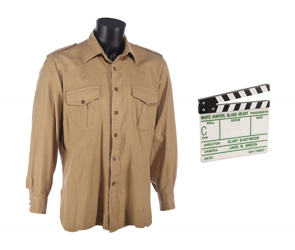 John Wilson’s (Clint Eastwood) safari shirt and a production clapperboard from Clint Eastwood’s adventure film White Hunter Black Heart. Wilson wore a military green shirt throughout the film as he and his crew pursued an elephant. The cotton military green shirt features a label with Eastwood’s name printed and “16” handwritten over it in black ink. The clapperboard has Eastwood’s name and that of the film’s director of photography, Jack N. Green, carved into the slate. A set of 18 black-and-white stills of Eastwood in the film accompany the lot, many of which feature him wearing a shirt of this style. Dimensions (clapperboard): 28 cm x 24 cm x 2 cm (11” x 9.5” x 0.75”)