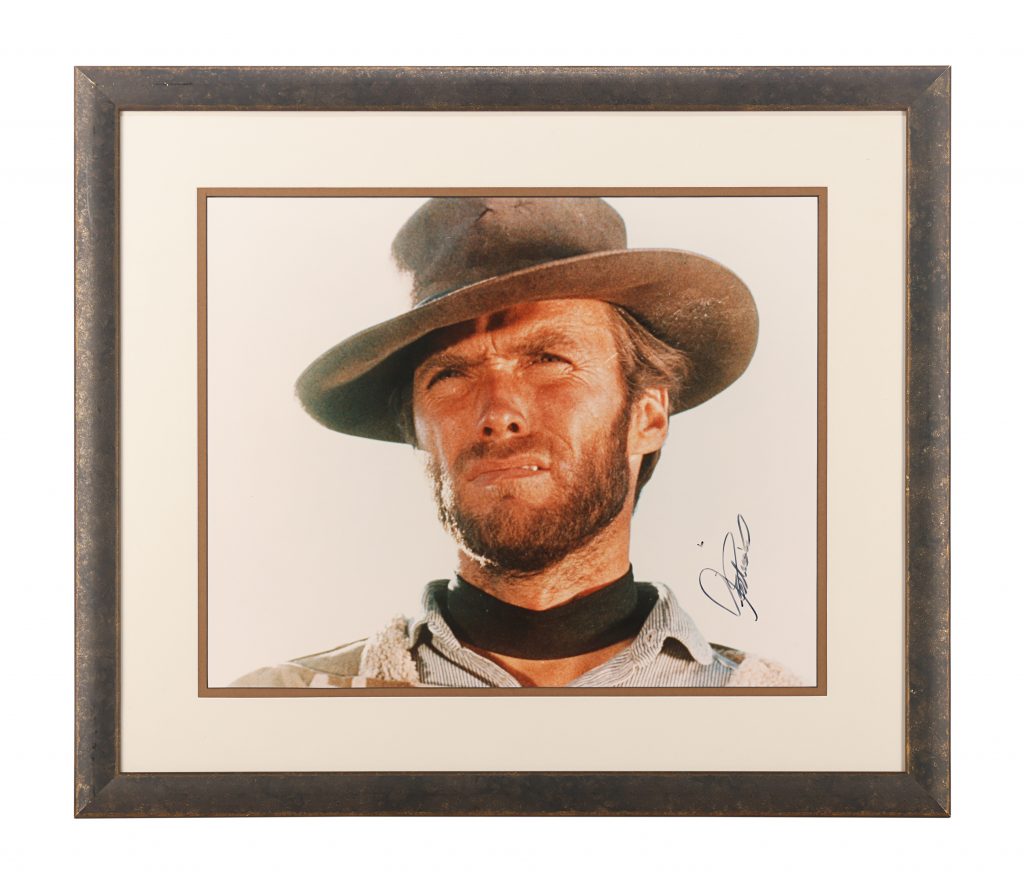 An autographed photo of Clint Eastwood from Sergio Leone’s Western classic The Good, the Bad and the Ugly. Eastwood autographed this photo of his iconic character - Blondie/The Man with No Name - in black ink. It is displayed in a custom-made frame. Dimensions: 76 cm x 86 cm x 3 cm (30” x 33.75” x 1.25”)