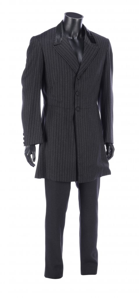 The costume comprises a black wool tailcoat with a white pinstripe pattern and an interior handwritten label reading “Fonda”; and a pair of black woolen trousers, also labelled “Fonda”. Both pieces are size “50” and each has interior labels from Italian costume supplier Costumi d’Arte Peruzzi. This item is likely to have been rented to numerous productions over the decades since filming. Some minor modifications may have taken place during that time, including material around the jacket collar that appears to have been changed from leather to silk.