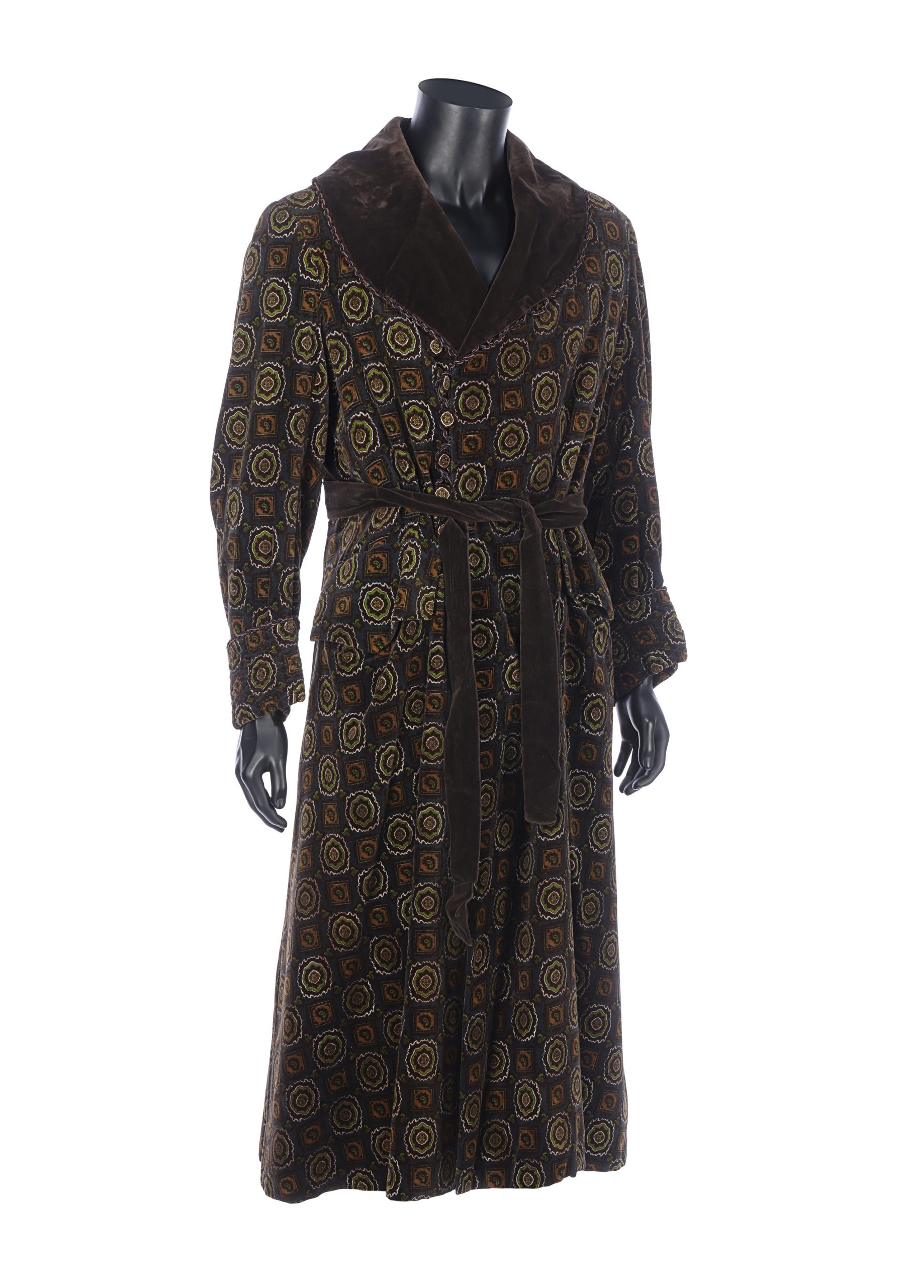 S.A.F.A.S collection as it was originally made by the tailoring house. The robe is made from dark grey velvet with green, brown, ivory and mustard- colored geometric patterns. It has a brown velvet lapel and belt, and a blank interior name label. It also has an interior label from Italian costume supplier Costumi d’Arte Peruzzi.
