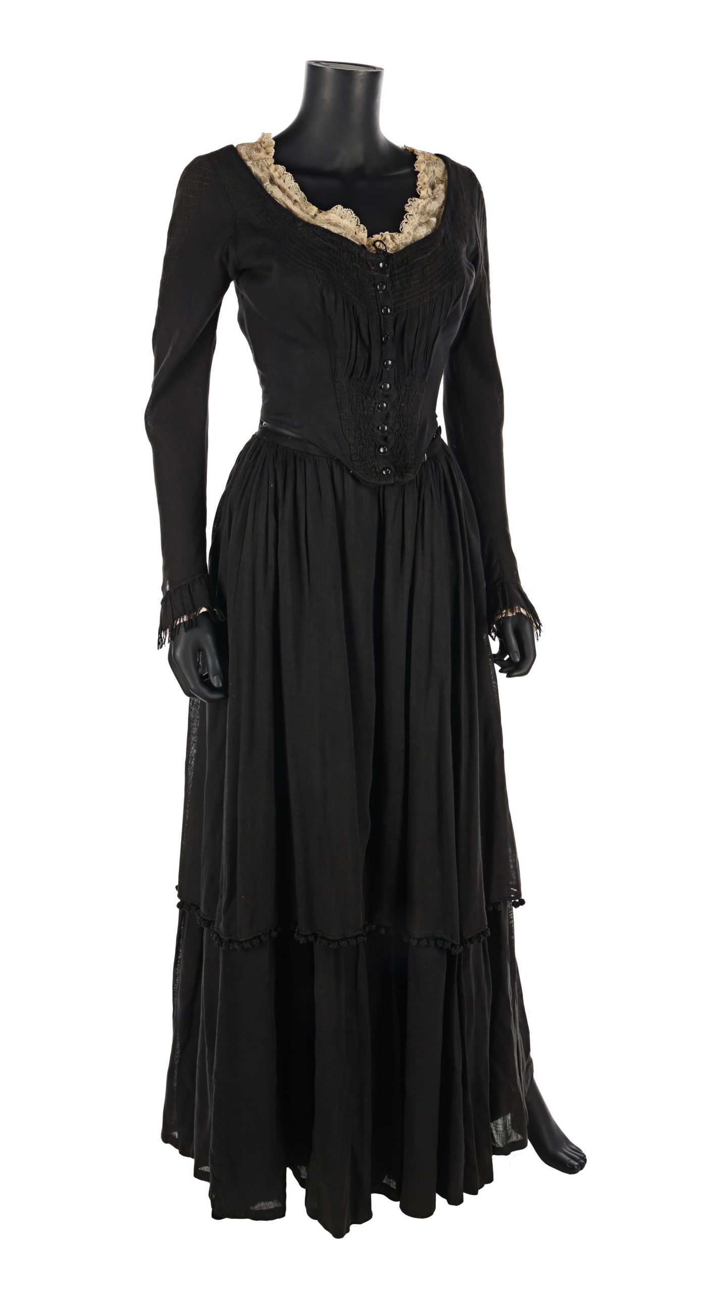 This lot comes from the archives of the Italian costume company Costumi d’Arte and is part of their S.A.F.A.S collection as it was originally made by the tailoring house. The costume comprises a black long-sleeved bodice and a long black layered skirt. The bodice buttons up at the front and has an elasticated waistband, although this has stiffened. Both garments feature handwritten “C. Cardinale” labels and labels from Costumi d’Arte Peruzzi. This item is likely to have been rented to numerous productions over the decades since filming. Some minor modifications may have taken place during that time, including a change to the lace lining around the bodice neckline.