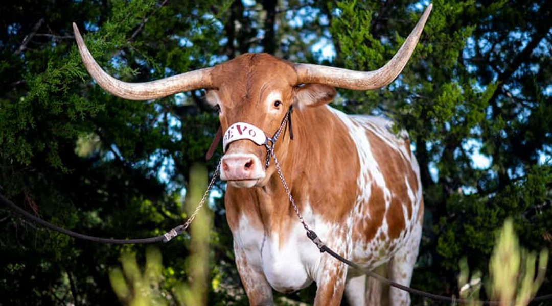 Bevo XV now resides on a private ranch in Liberty Hill, Texas, owned by Texas ranchers Betty and John Baker. The Bakers’ Sunrise Ranch is responsible for decades of Bevos, raising the famed longhorns alongside their other cattle, upholding centuries of ranching traditions.