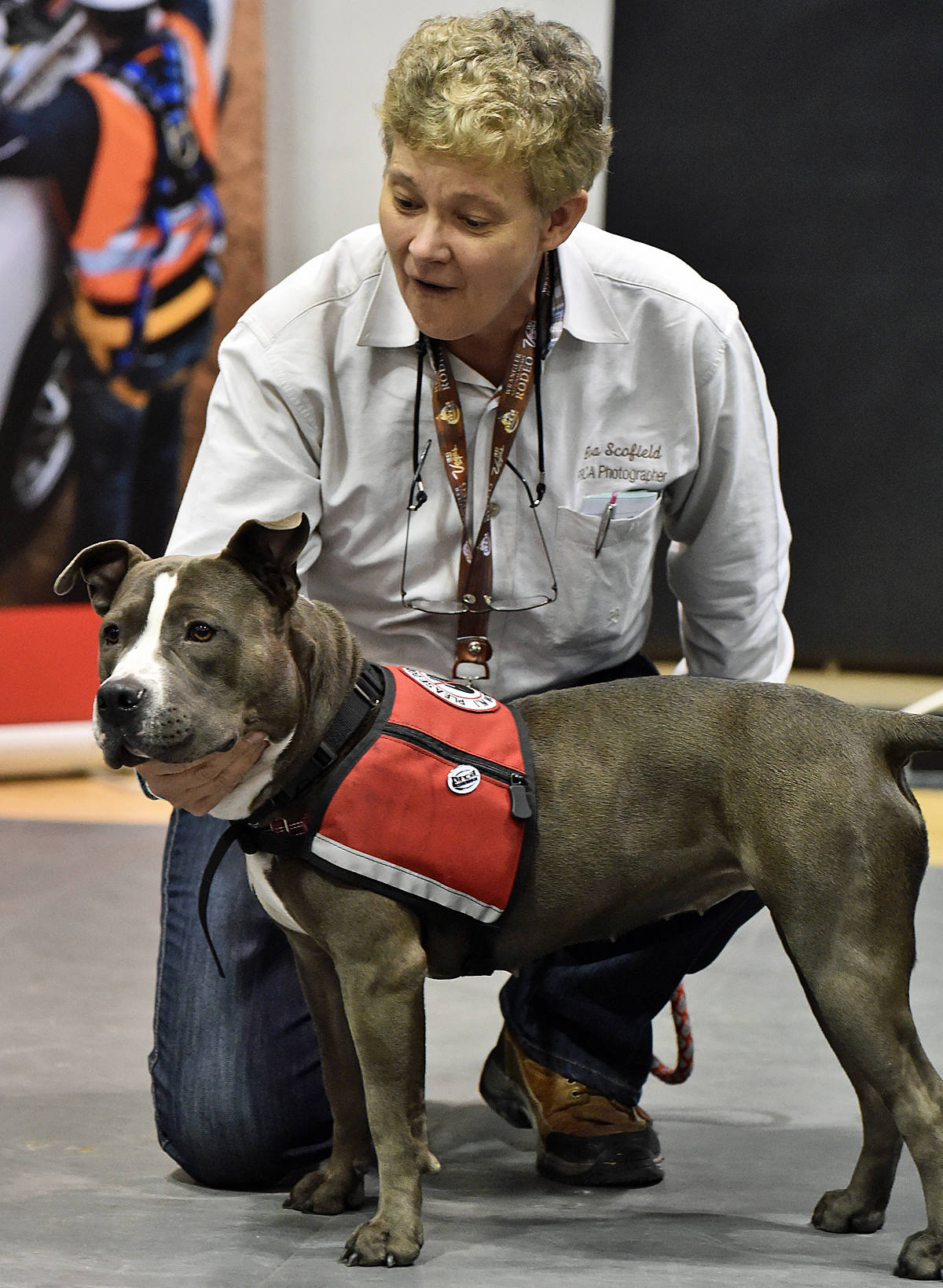 Her official service dog vest says “Please Don’t Pet Me.” Fat chance among the cowboys and cowgirls of the Wrangler National Finals Rodeo. Everything about her from her huge block head and matching paddle paws, to those comely eyes and lopsided grin is irresistible.