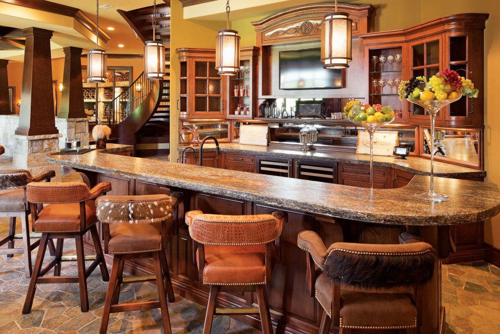 Adjacent to the sitting area, a fully outfitted game room offers poker, billiards, and board games, and a grotto-style wine cellar replicates wine caves found in ancient Tuscany. “The room started out as a square white space,” Williams says. “We used old barn wood on the ceiling and walls to give the room an aged appearance. Then Dave Schmidt of PJB Designs cast faux pillars out of plaster, which were made to look like stacked stone columns. Finally we added old clay roof tiles of different sizes to hold the bottles. The result is really remarkable.”