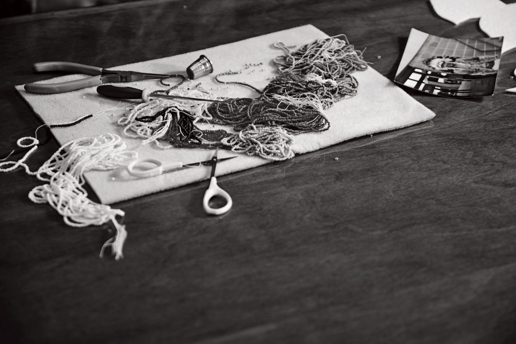 To tell their stories, Margo and her family members are using beading techniques passed down through generations — instruction that has come through story, demonstration, and observation, taught by mothers, aunties, and kaalas (grandmothers) to the younger family members. The table is covered with scraps of felt, leather, pliers, and beads in every color imaginable. Each woman has brought her own personal project to work on. After dinner and a prayer, they begin to painstakingly push tiny needles through punched leather. This is time-consuming, but it’s obviously a labor of love.