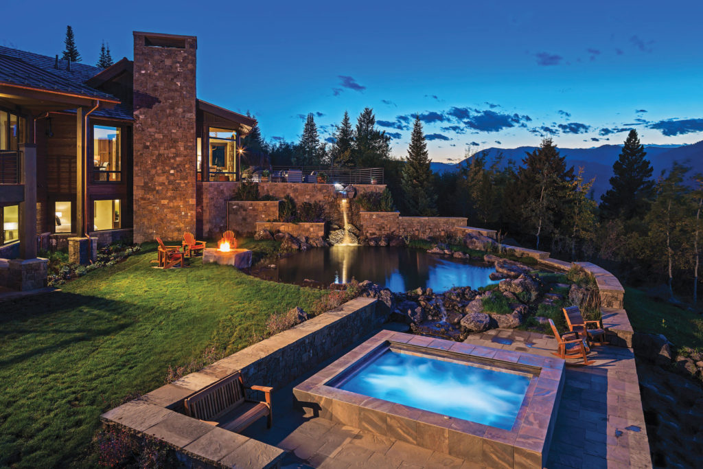 Outside of the master bedroom, Zoske created a resort-like setting with a stream, a 7-foot waterfall, and a large pond that flows into the side of a modern 12-person hot tub. “For me, the inside is as good as the outside,” he says. “This has got to be one of the best views of the valley, and this is as good as it gets.”