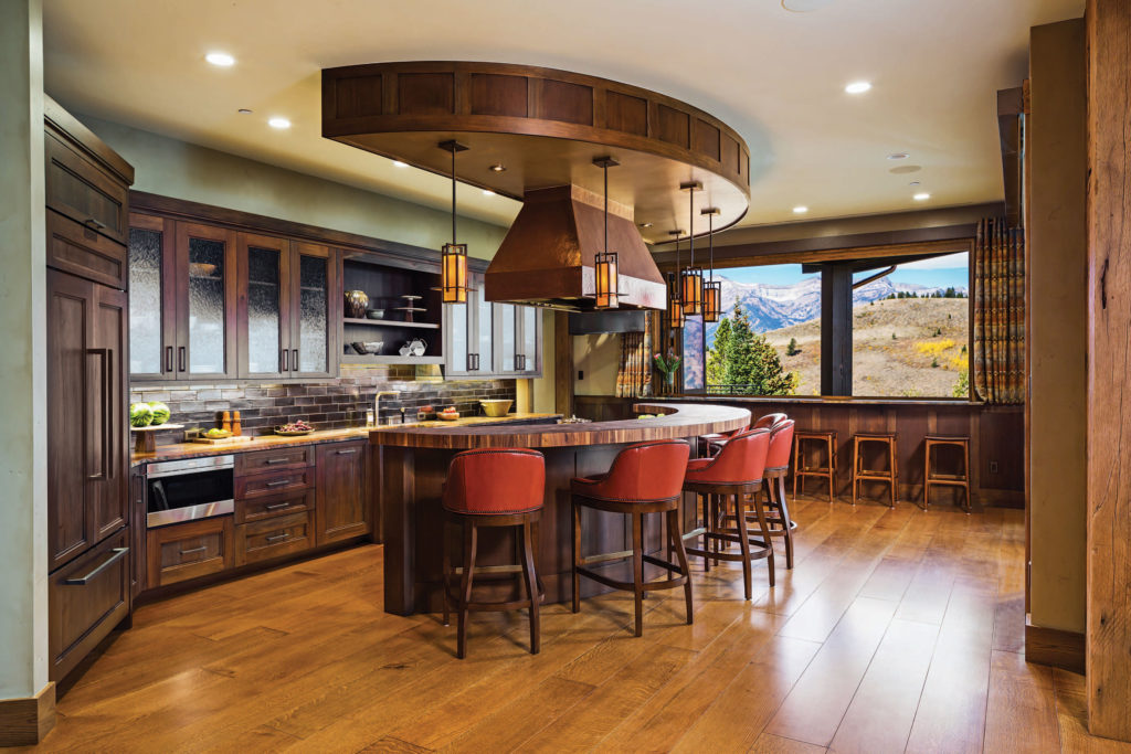 With the property lined with sweeping views and roaming wolves, bears, elk, and moose, the home offers a sense of seclusion. “You can’t see another house from up there, and you cannot see the neighbors,” Zoske says of the prime spot for hosting large gatherings. “[The owner’s] an entertainer, and we really designed the house around entertaining.”
