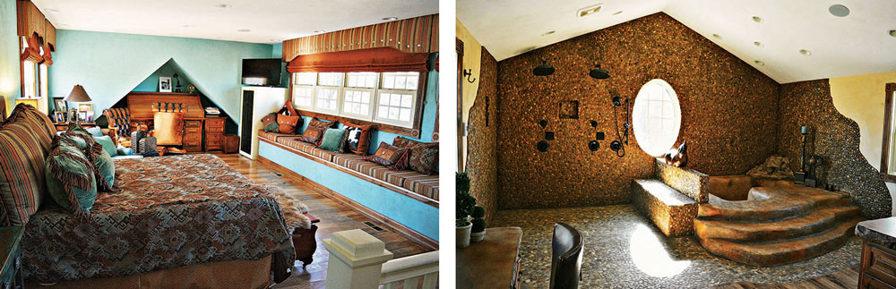 In the master bathroom, Deutsch lined the floor and walls of the vast open shower and walk-in bathtub with flat river pebble stone, crafted a built-in bench overlooking the Flint Hills prairie, and adorned the space with a concrete rock fountain designed by Concrete Design of KC.