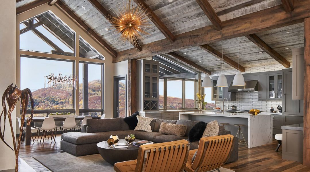 There’s an exquisite waterfall in Steamboat Springs, Colorado, from which one can soak in the surrounding views of ascending topography and rugged mountain peaks. However, years of natural erosion didn’t sculpt this sinuous display. Rather, it’s a waterfall-style kitchen island, hewn from striated Calacatta quartz, centered in the nearly 3,500-square-foot vacation home of Donna and Thad Minyard.