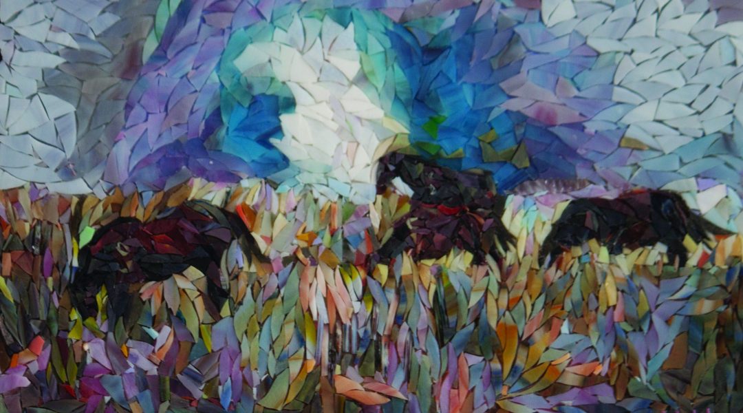 Later, these childhood inspirations would find creative expression in vitreous glass painting, a process in which she chooses and assembles shards of colored glass to compose images. Today Hollstein creates her glass pieces in suburban Salt Lake City, where she lives with her Utah-born husband, daughter, son, and three cats in view of the Wasatch Mountains. We spoke with her as she prepared for the upcoming Calgary Stampede Art & Lifestyle Show.