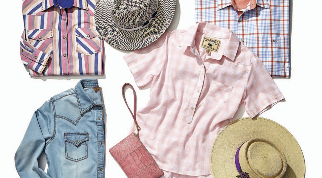 1. Sherry Cervi striped snap shirt ($54) by Resistol 2. American Hat Company custom blue and white straw fedora with grosgrain band from Best Hat Store 3. Men's plaid button-down ($52) by Resistol 4. Palaka popover shirt ($145) by Western Aloha 5. Belted denim shirtdress ($54) by Wrangler 6. Wild alligator wristlet ($500) by Casa Del Rio 7. Cloud Break straw hat with embroidered flower ($60) by Stetson 8. Lavender pearl-snap with contrast cuffs ($60) by Resistol 9. Ashley floral blouse ($49.99) by Whistle River Trading