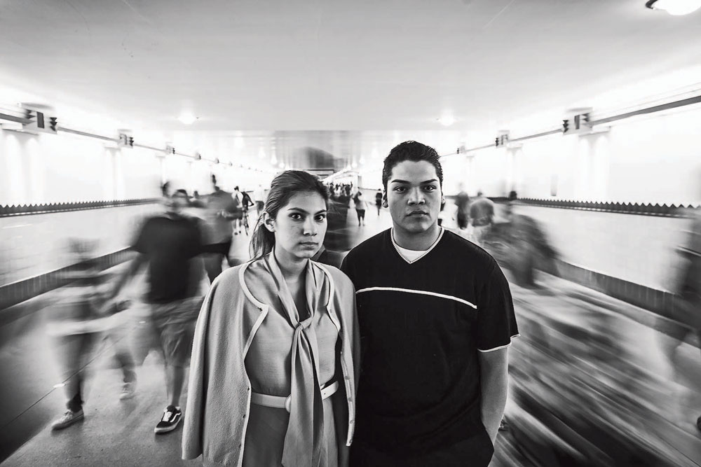 Photography: (featured, detail) From Real NDNZ Retake Hollywood, actress Shayna Jackson (Dakota/Cree) channeling Hollywood Icon Audrey Hepburn; (slideshow) Crossways, Heather Singer (Navajo) and Spencer Battiest (Seminole/Choctaw) at Union Station; Blessing, Kenneth Ramos (Barona Bands of Mission Indians) in Indian Alley; From Real NDNZ Retake Hollywood, actress Shayna Jackson (Dakota/Cree) channeling Hollywood icon Audrey Hepburn; From Legacy of Exiled NDNZ, seven young Natives at Indian Alley in downtown Los Angeles; From Real NDNZ Retake Hollywood, actor-musician Noah Watts (Crow/Blackfeet) channeling Hollywood Elvis Presley; actress JaNae Collins (Dakota/Crow) channeling Jane Russell; From Legacy of Exiled NDNZ, pictured in Los Angeles: Welcome to Los Angeles, at Union Station.