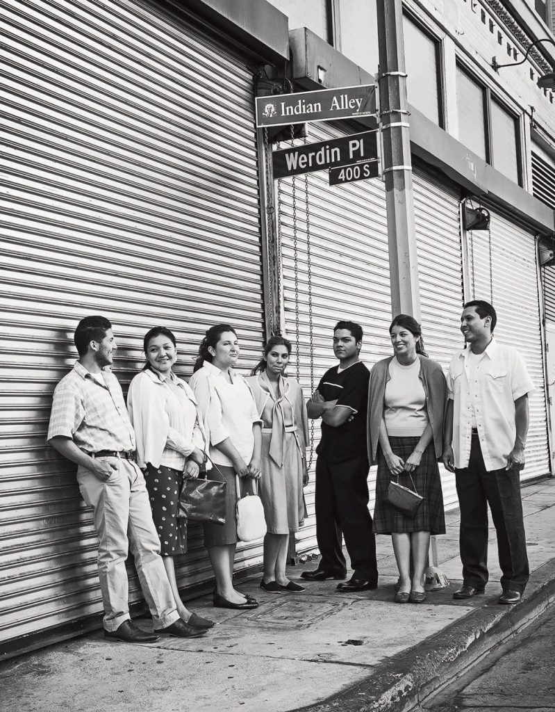 As an illustration of a language and culture in transition, NDNZ perfectly suits Peters’ favored leitmotif. A commemoration of the U.S. government’s American Indian Urban Relocation program of the 1950s, Legacy of Exiled NDNZ presents stories and images of seven young Native Americans carving out adult lives in Los Angeles. The hook is a heavily stylized production that presents her subjects in black-and-white and in fashions that evoke the 1950s, when thousands of Native Americans migrated to California and other states for work through the voluntary program.