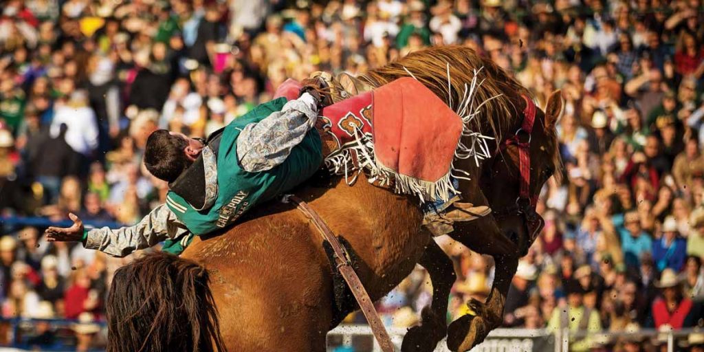 Featured Image: Jake Twissleman picks Jacob Lees off of a bareback horse during a previous edition of the Poly Royal Rodeo. Above: Thousands gather for the annual event at the Alex G. Spanos Stadium.