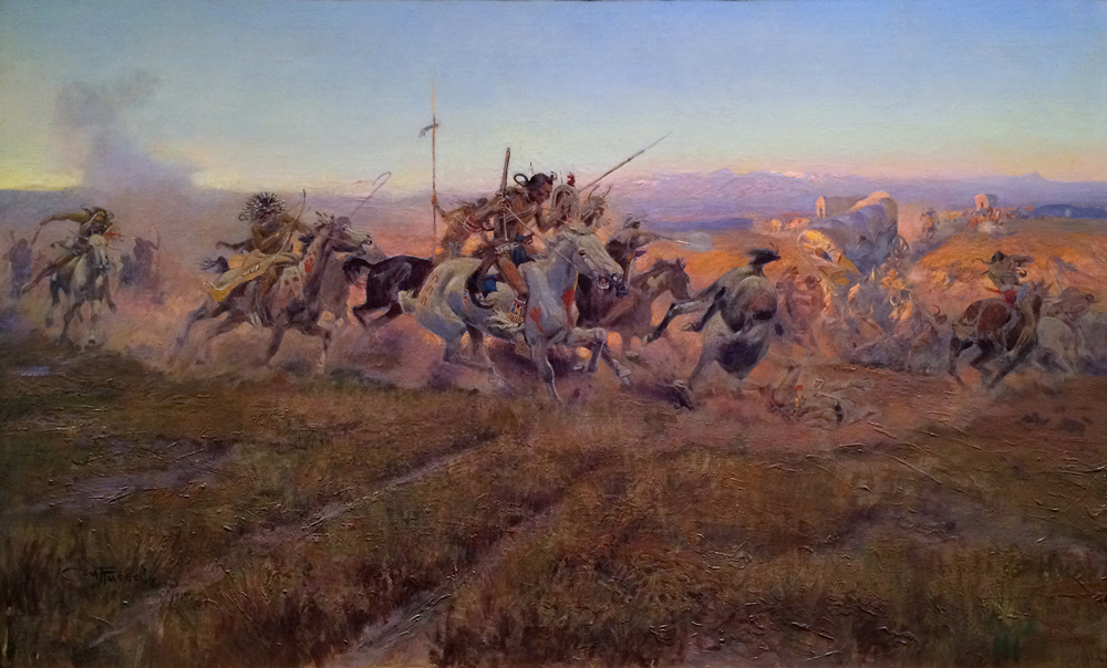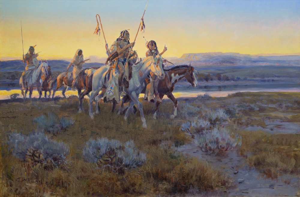 Photography: (all by Charles M. Russell [1864-1926]/Courtesy C.M. Russell Museum) (featured) The Navajos, 1919, oil on canvas, 24” x 36”, Desert Caballeros Western Museum, Wickenburg, Arizona, Gift of Mr. and Mrs. Aiken Fisher, photograph © Terrence Moore; One of the Rough String, oil on canvas, 24” x 33”, Collection of Glenbow Museum, Calgary, Alberta (992.39.1); Piegans, 1918, 24” x 36”, Petrie Collection, Denver; When Law Dulls the Edge of Chance, 1915, 30” x 48”, Buffalo Bill Center of the West, Cody, Wyoming, gift of William E. Weiss (28.78); The Navajos, 1919, oil on canvas, 24” x 36”, Desert Caballeros Western Museum, Wickenburg, Arizona, Gift of Mr. and Mrs. Aiken Fisher, photograph © Terrence Moore; Jumped, 1914, oil on canvas, 30” x 48”, Petrie Collection, Denver.