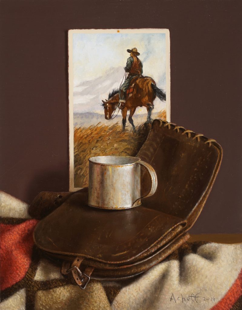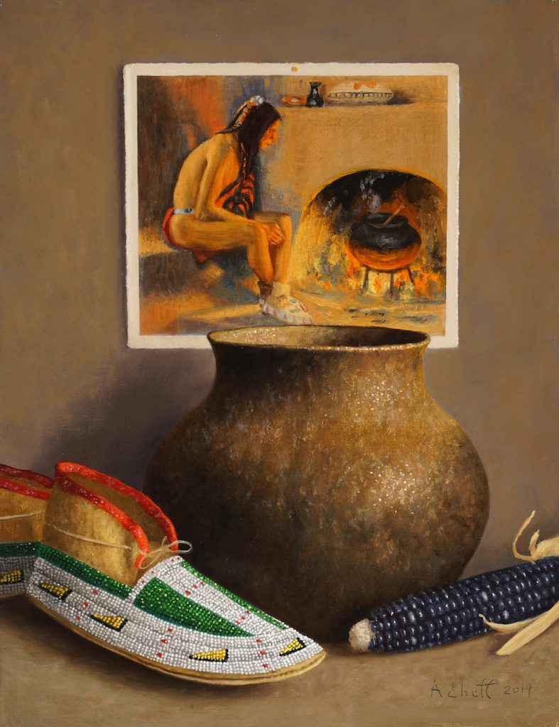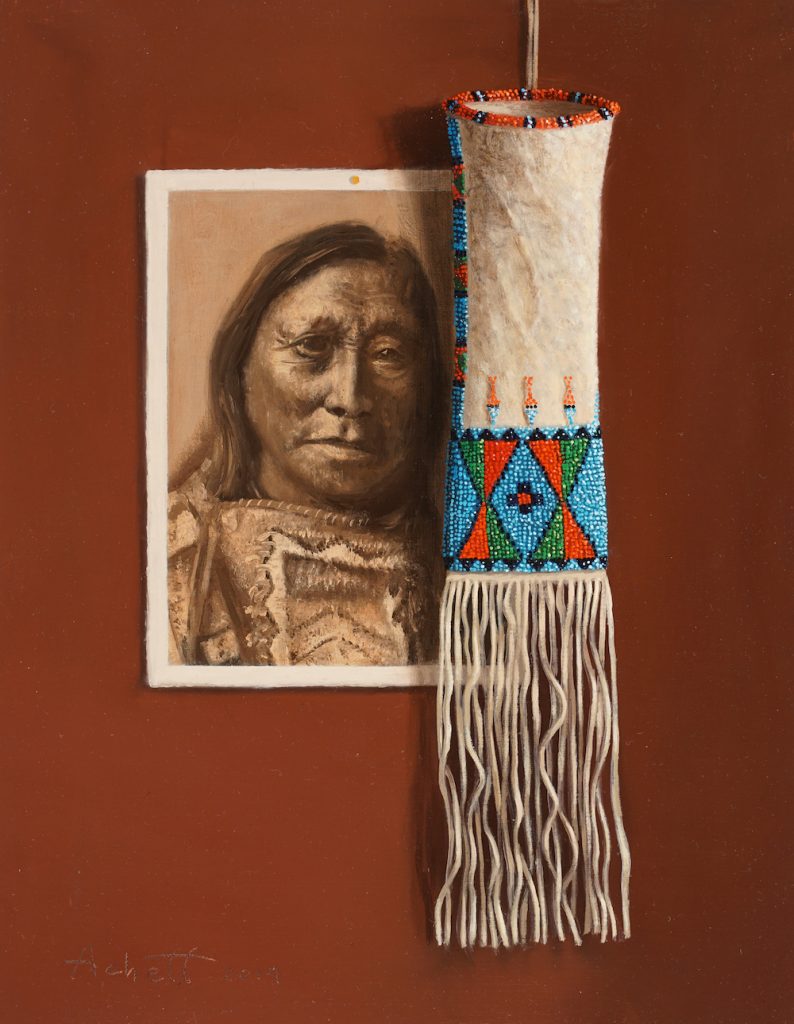 Acheff’s process often begins with seeing a photograph or a print and thinking it would be great in a painting. “I started painting Curtis photographs in the ’70s, and I thought that would be a great way to extend the theme with the artifact. I like to see an object and see how it feels to me. What do I get out of it? What is the common emotion?”