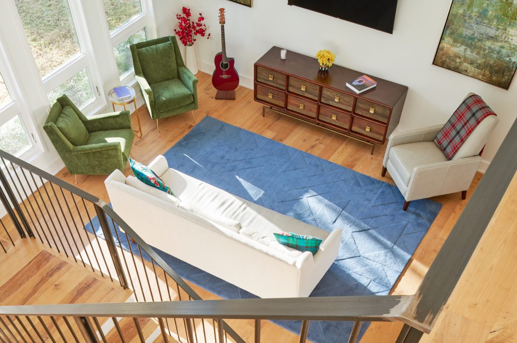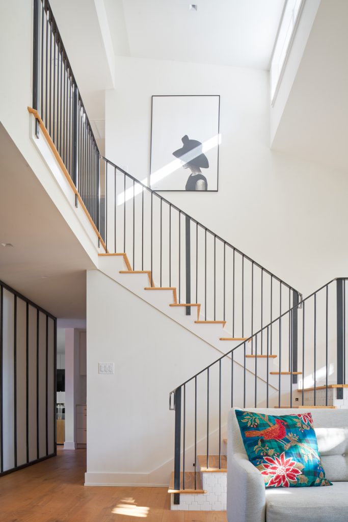Sleek iron rails, light wood flooring, and geometric Ann Saks tiles modernize the custom staircase.