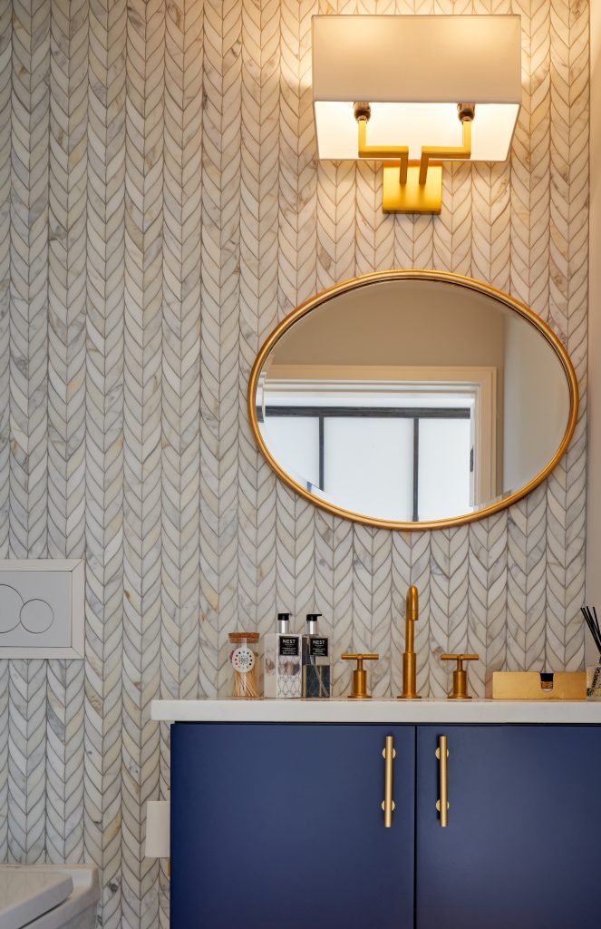 Exquisite gold fixtures paired with a speckled chevron backsplash transform a once dingy kitchen.