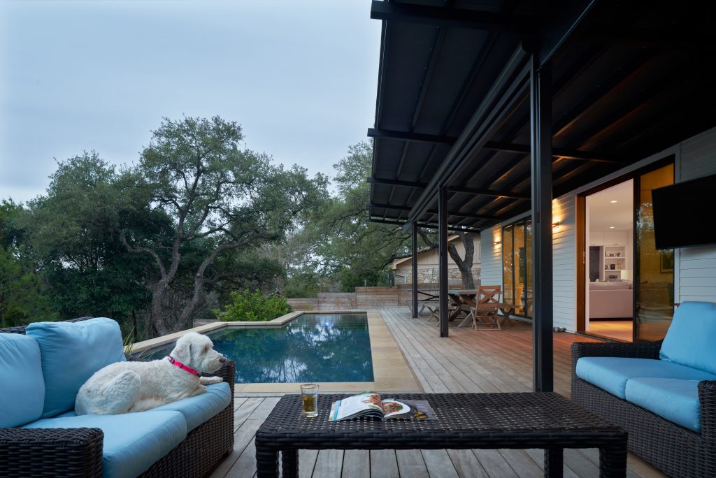 A brand new deck, custom pool, and outstretched awning complete the patio renovation.