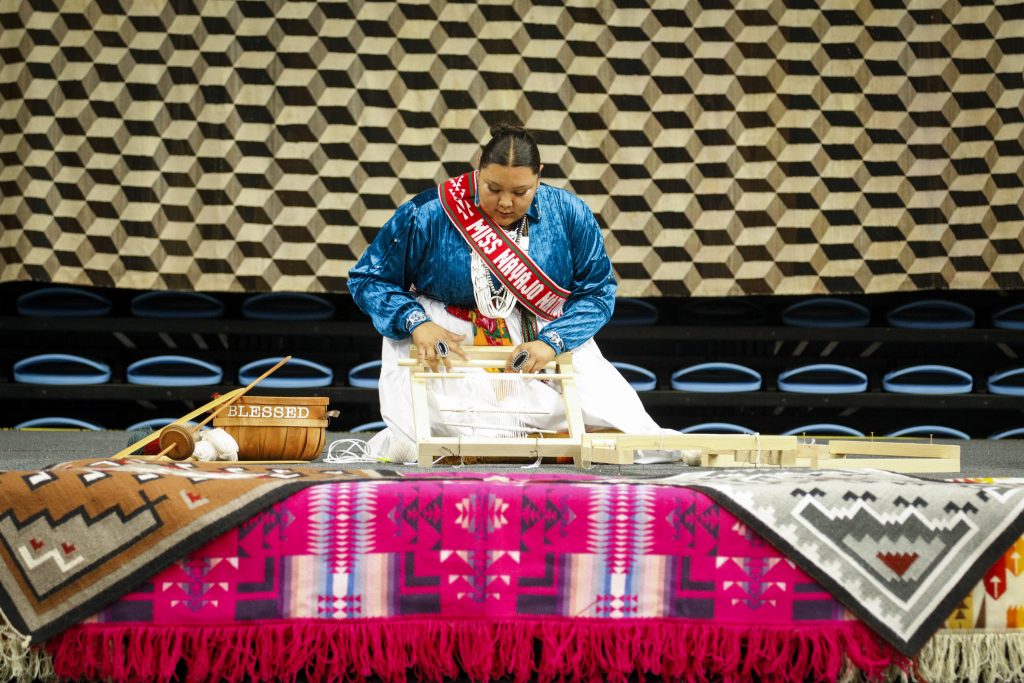 Later I stop in at a couple of competitive events for the Miss Navajo Nation contest. This is a beauty pageant like no other. Based on the idea of inner beauty and knowledge of traditional skills — butchery, weaving, the Diné language, and much more — the competition shows serious dedication among the competitors. Most of the contestants are in their early to mid-20s; they cannot be married or have children (they also must be at least 18). They conduct business interviews and present a platform of how they would encourage holistic health, promote the Diné language and songs, advocate for victims of domestic violence, and bring awareness to the crisis of murdered Indigenous women. I observe many of them taking notes and studying.